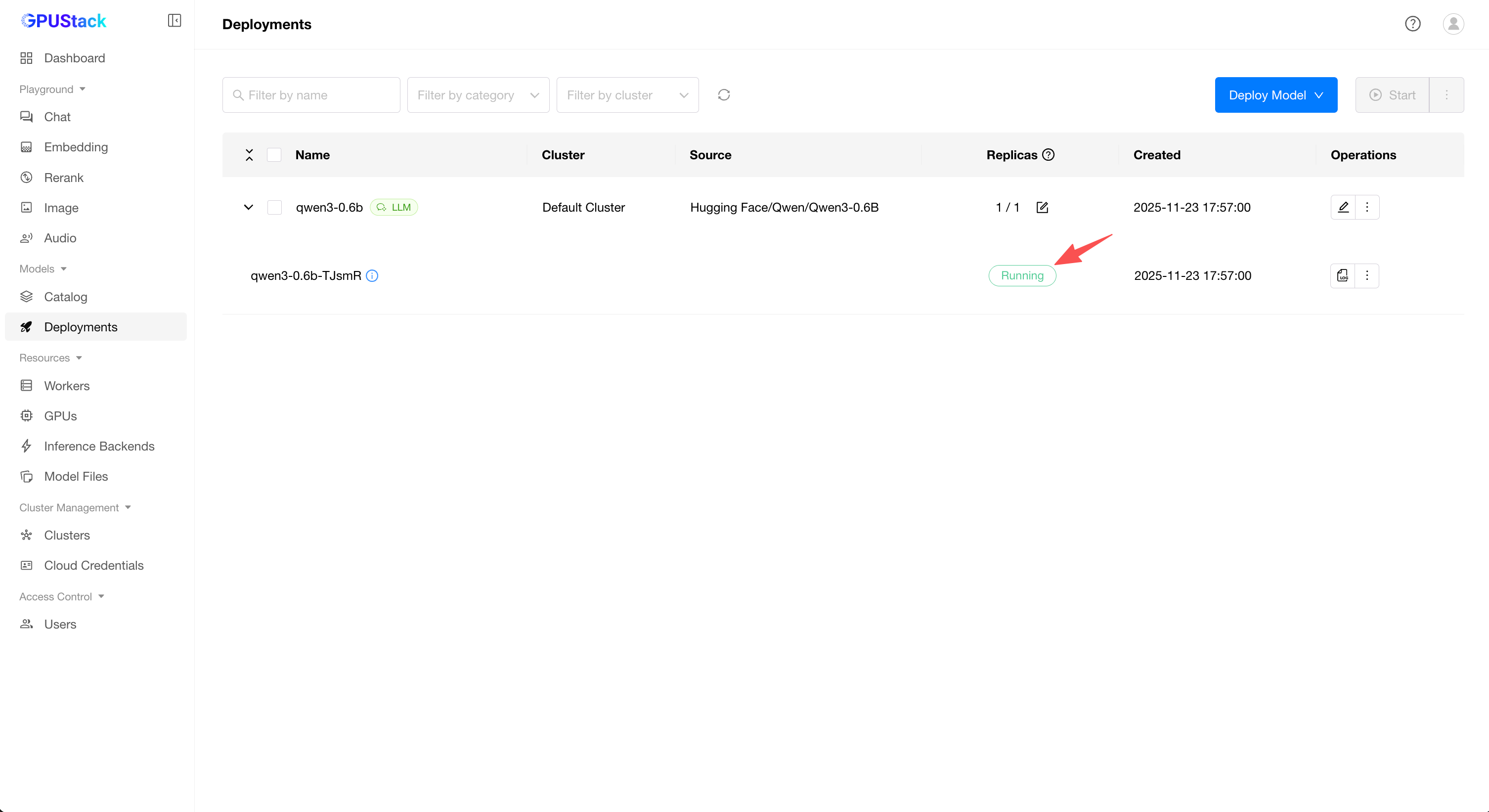 - GPUStack will start downloading the model files and deploying the model. When the deployment status shows