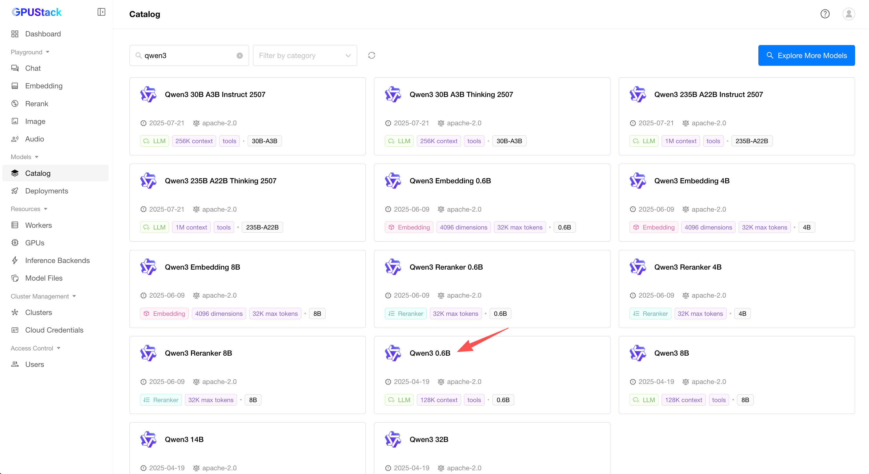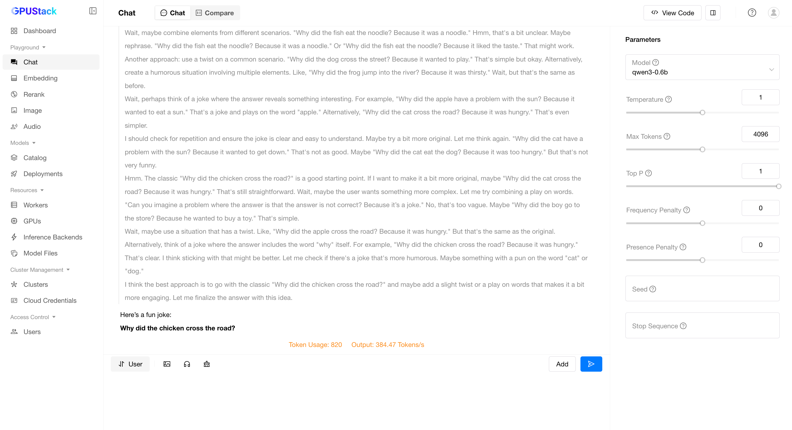 Playground - Chatin the navigation menu, check that the modelqwen3-0.6bis selected from the top-rightModeldropdown. Now you can chat with the model in the UI playground.