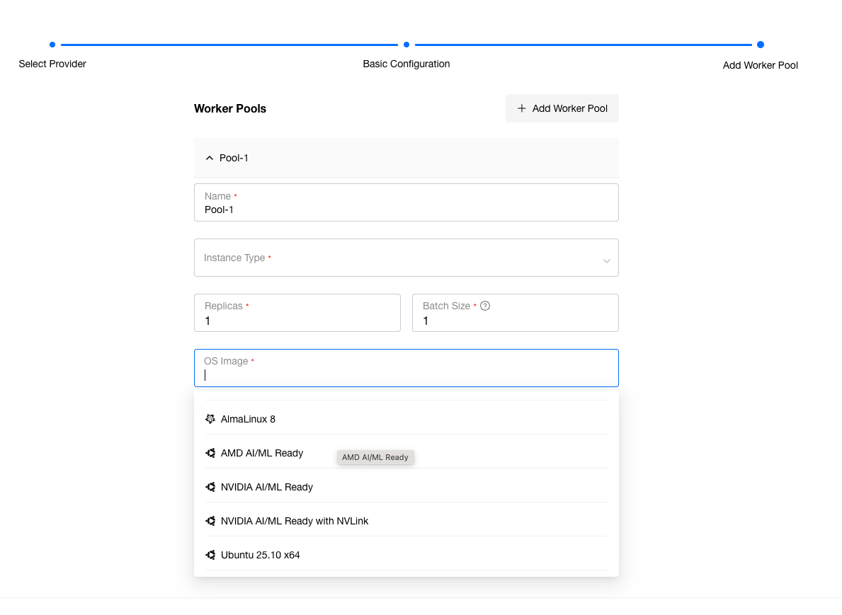Fill in the Name, Replicas, and Batch Size as needed. Then select the Instance Type (droplet size in DigitalOcean terms) for the worker pool.