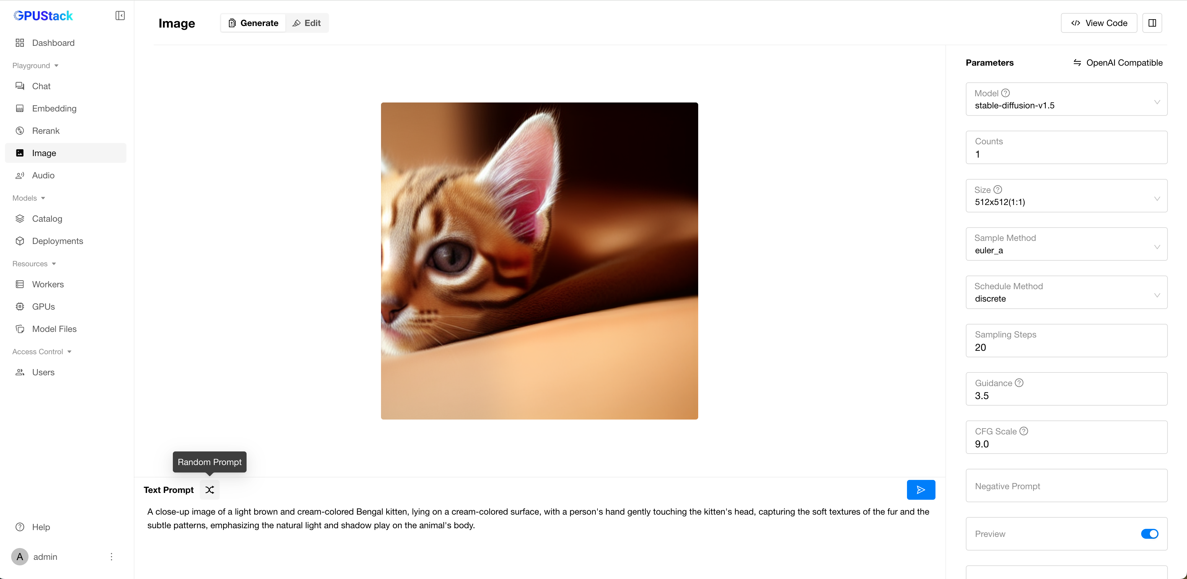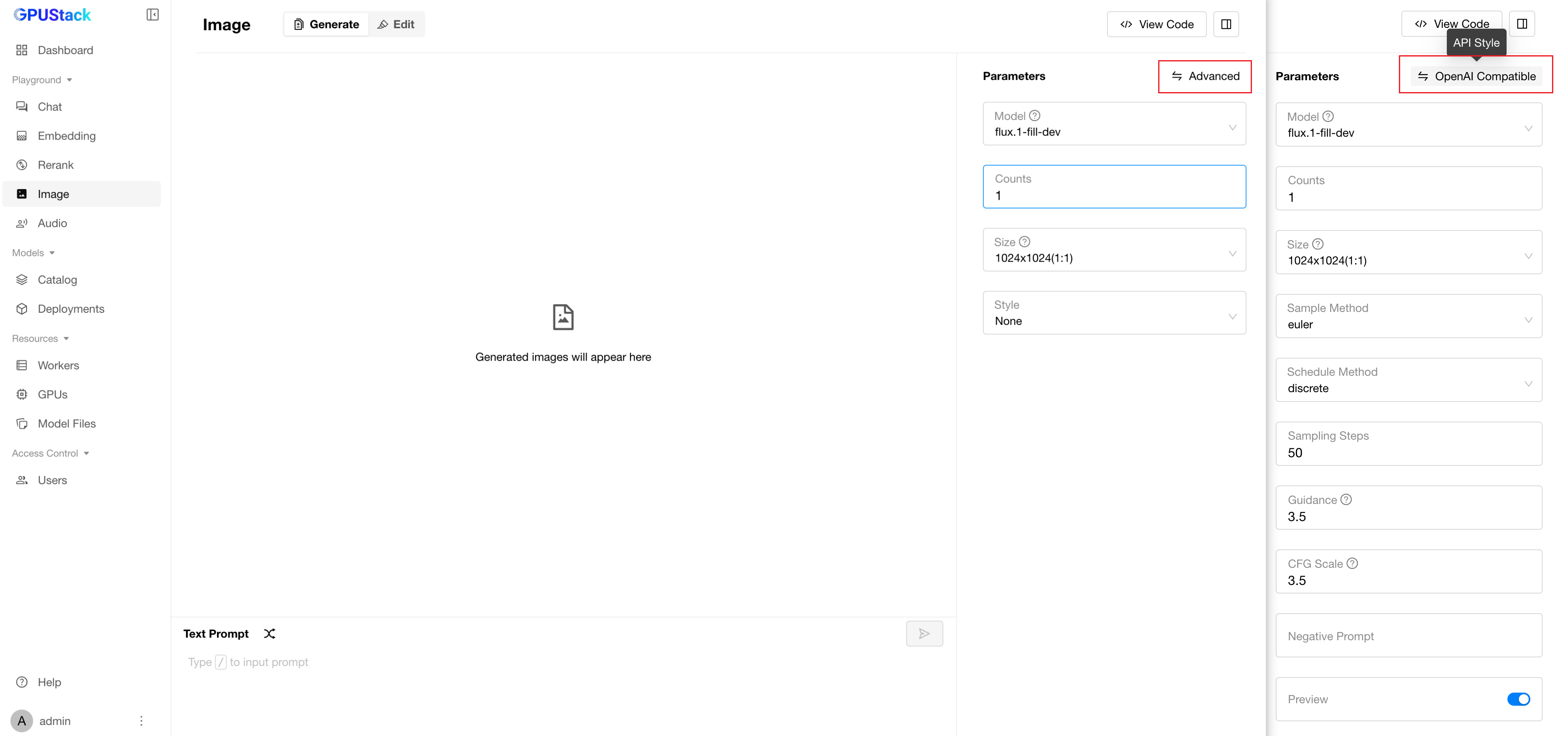 The Image Playground is a dedicated space for testing and experimenting with GPUStack’s image generation APIs. It allows users to interactively explore the capabilities of different models, customize parameters, and review code examples for seamless API integration.