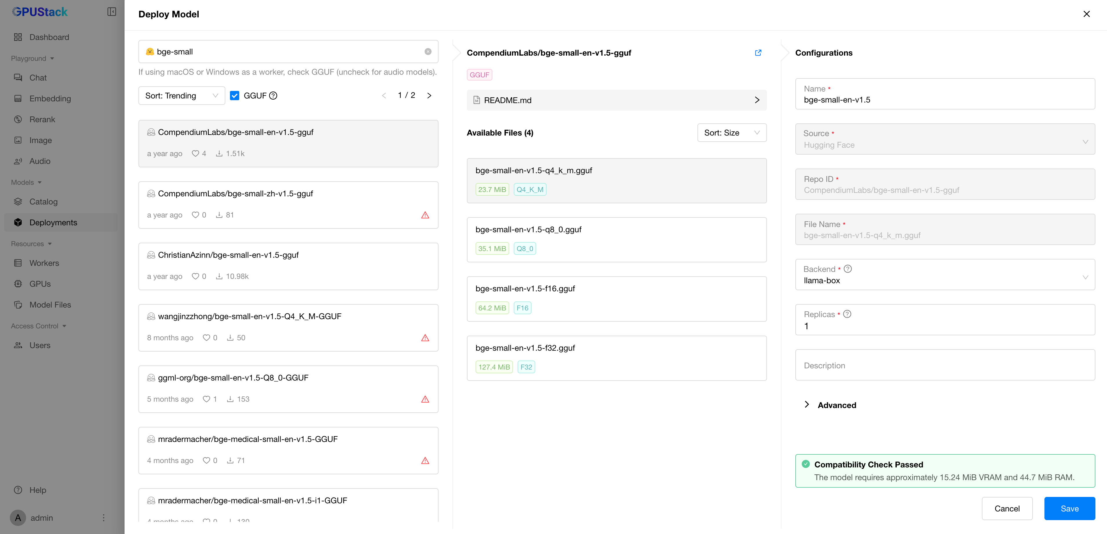CompendiumLabs/bge-small-en-v1.5-gguf. - Leave everything as default and click the