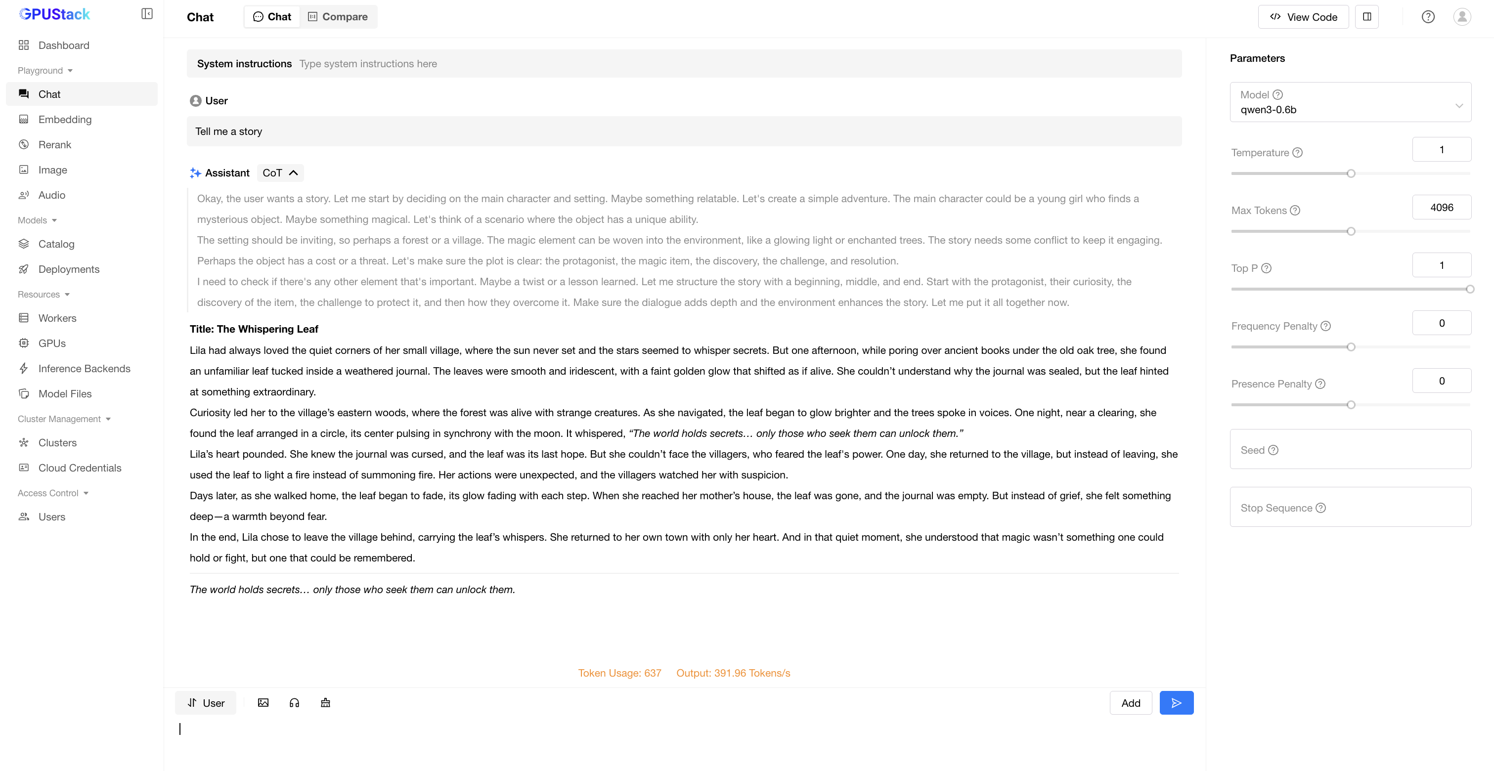 By following these steps, you can leverage LLMs for AI-powered text generation and natural language tasks in GPUStack. Experiment with different prompts and settings to explore the full capabilities of LLMs!