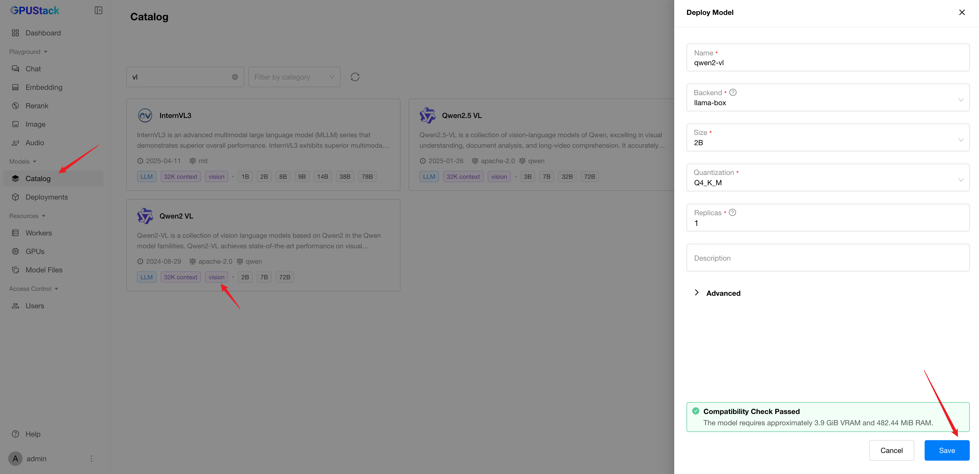 Vision language models in the catalog are marked with the vision capability. When you select a vision language model from the catalog, the default configurations should work as long as you have enough GPU resources and the backend is compatible with your setup(e.g., vLLM backend requires an amd64 Linux worker).