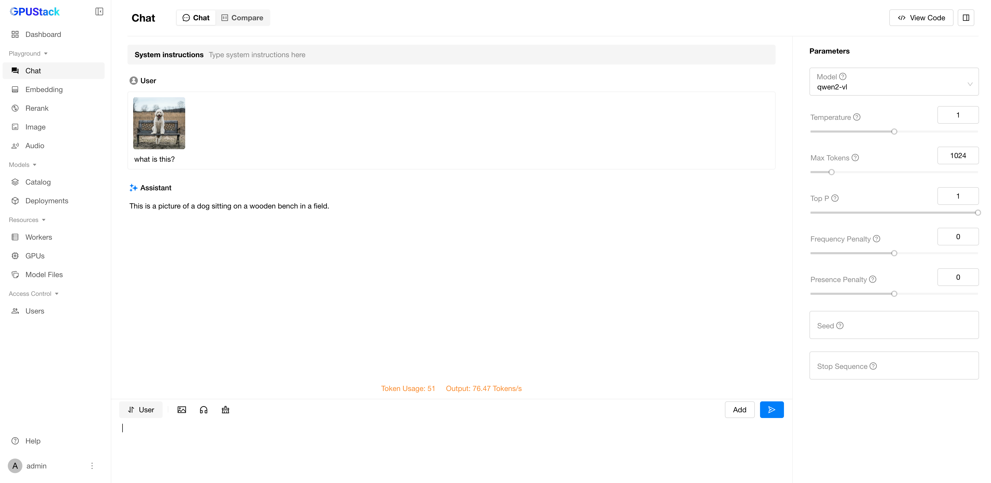 Vision Language Models can process both visual (image) and language (text) data simultaneously, making them versatile tools for various applications, such as image captioning, visual question answering, and more. In this guide, you will learn how to deploy and interact with Vision Language Models (VLMs) in GPUStack.