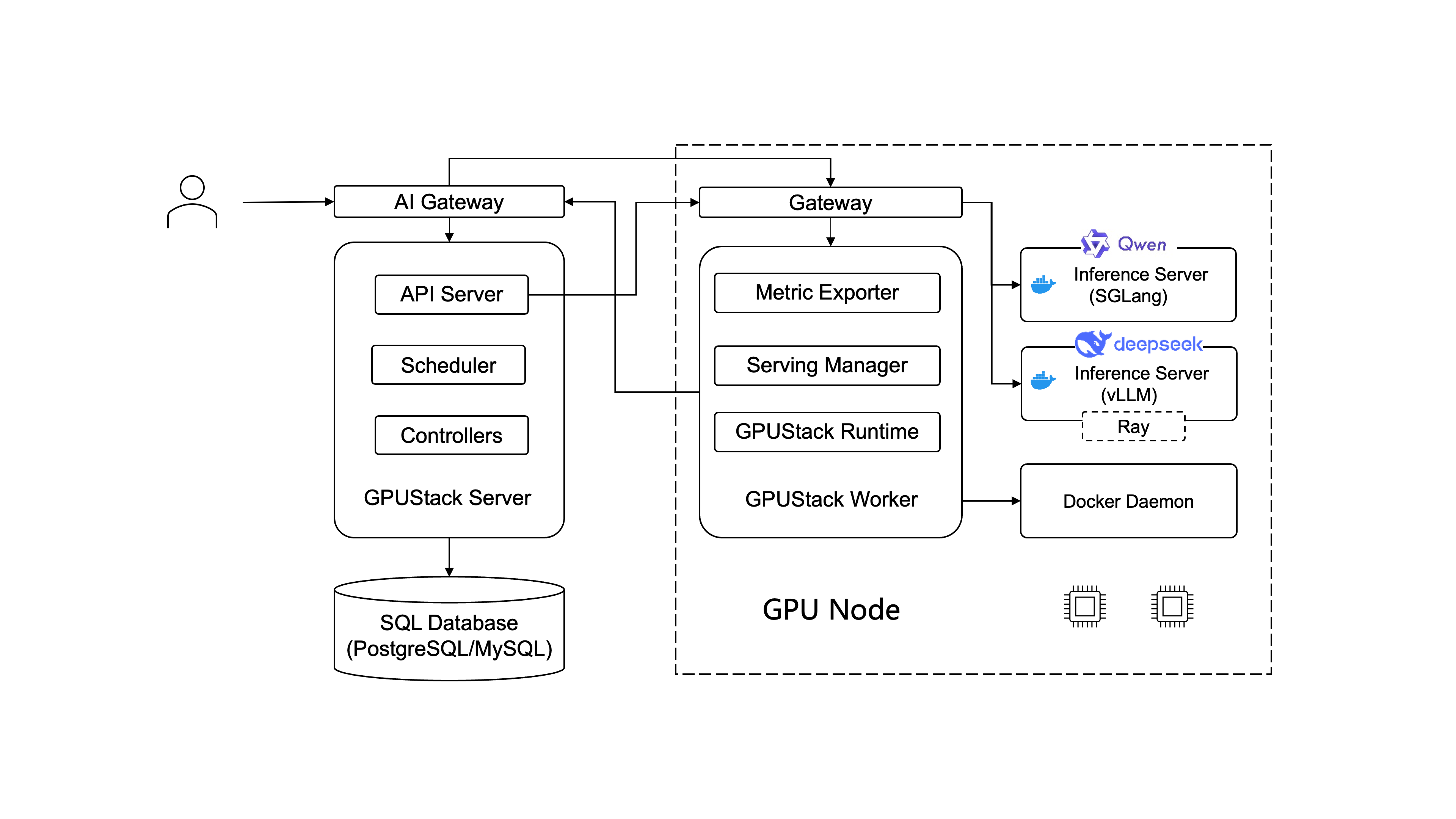 The diagram below provides a high-level view of the GPUStack architecture.