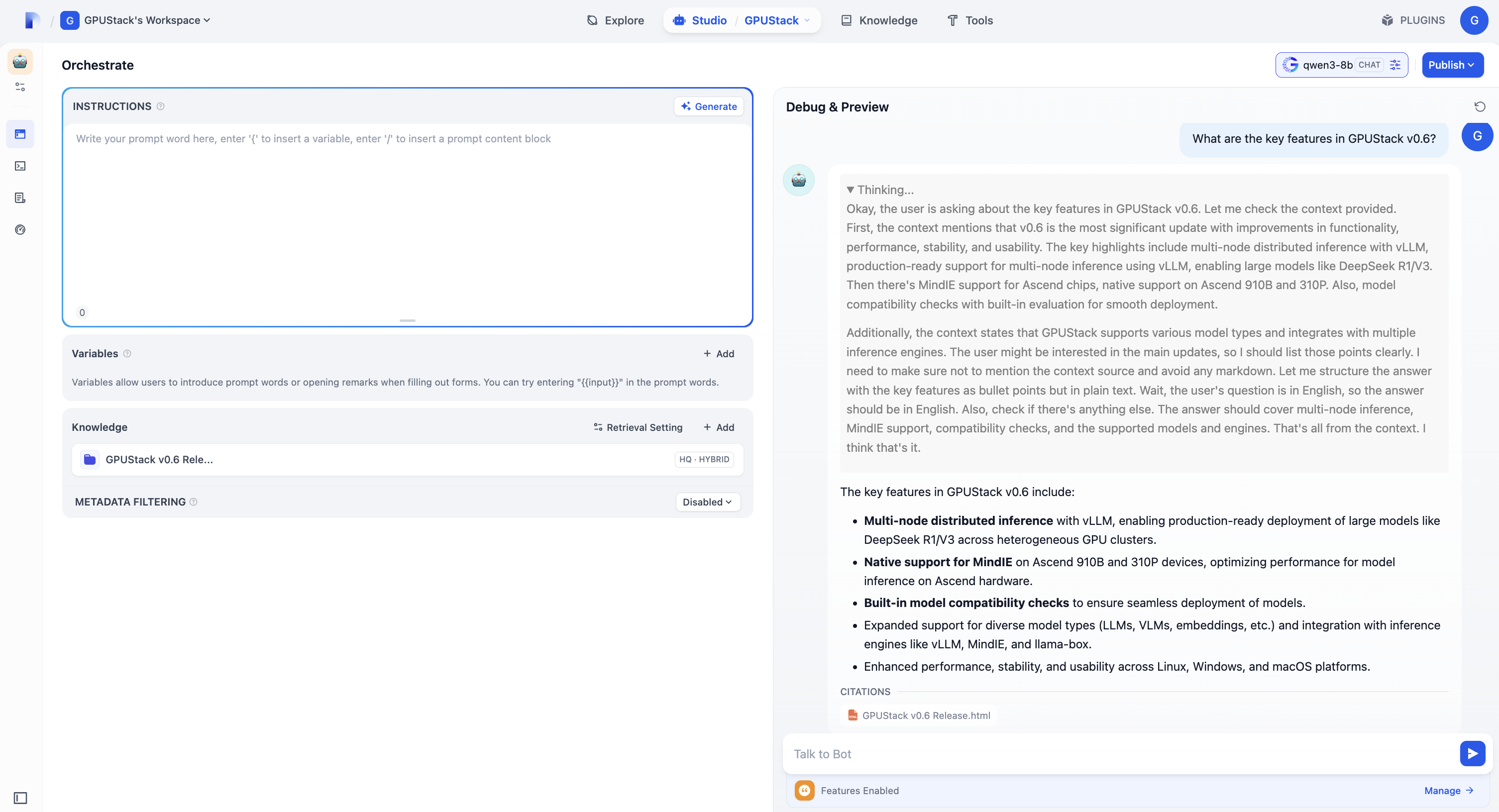 Studio, add the previously created knowledge, select the chat model, and interact with it: