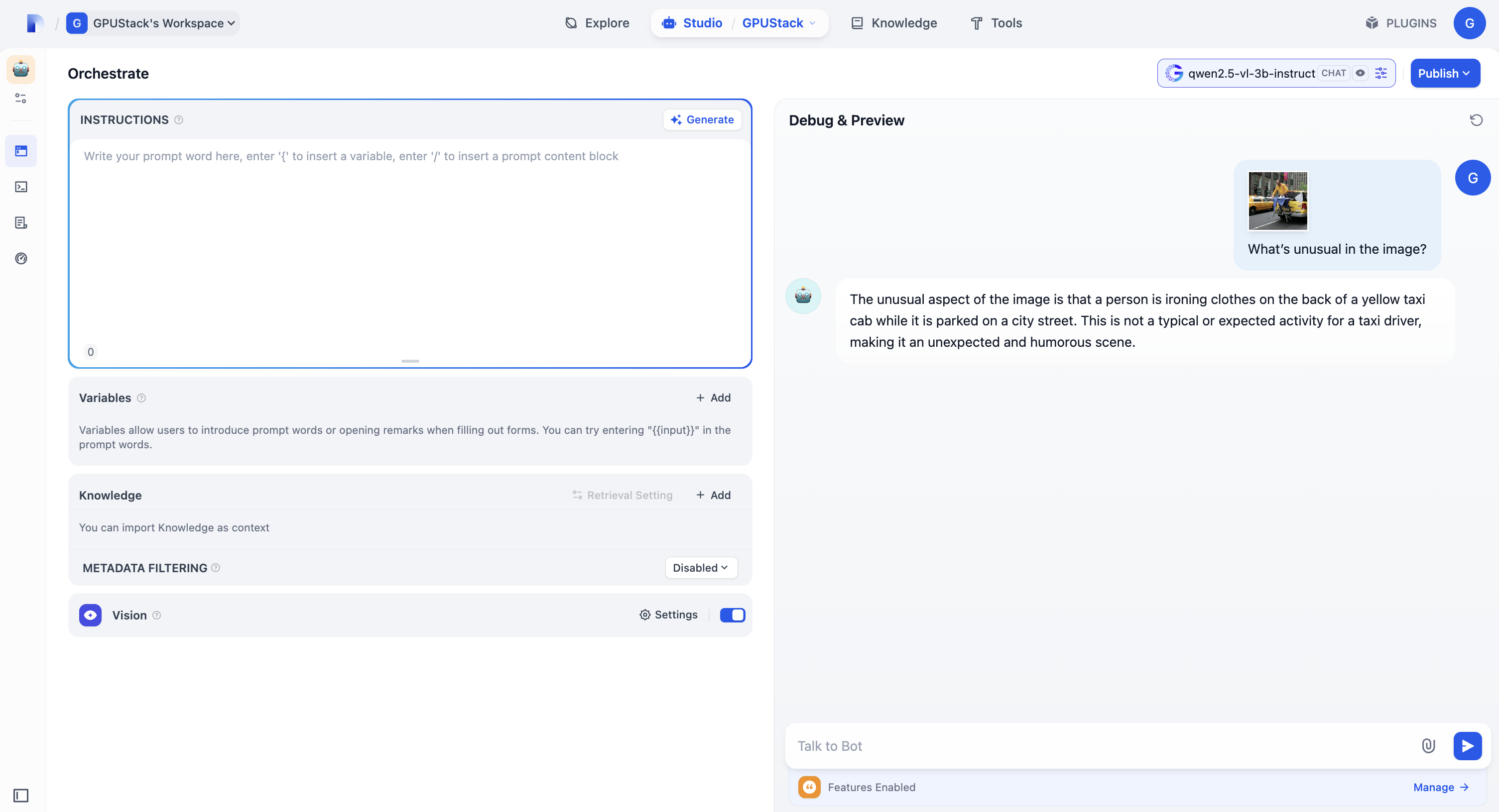 qwen2.5-vl-3b-instruct, remove the previously added knowledge base, enableVision, and upload an image in the chat to activate multimodal input:
