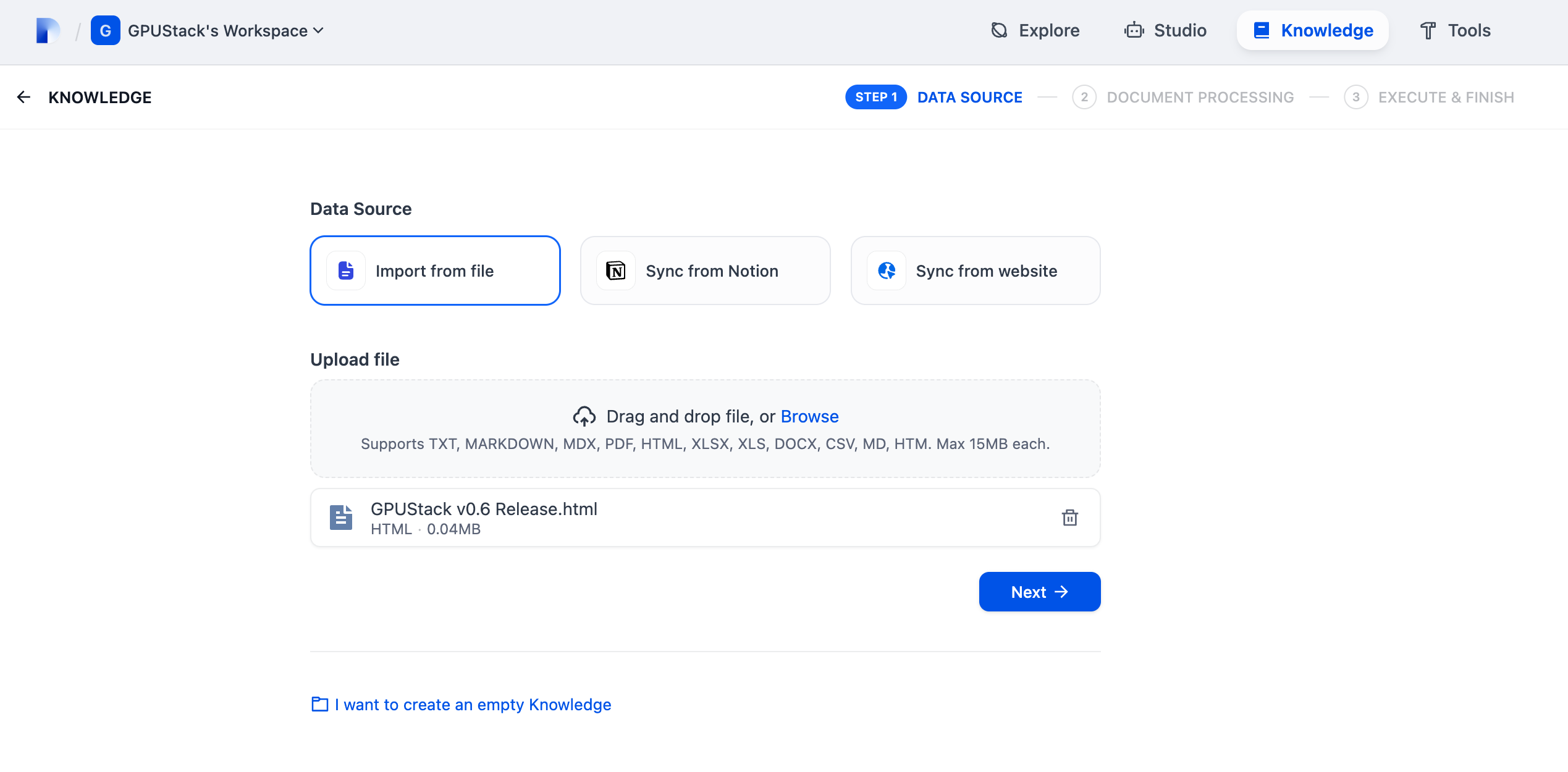 Knowledgeto create a knowledge, and upload your documents: