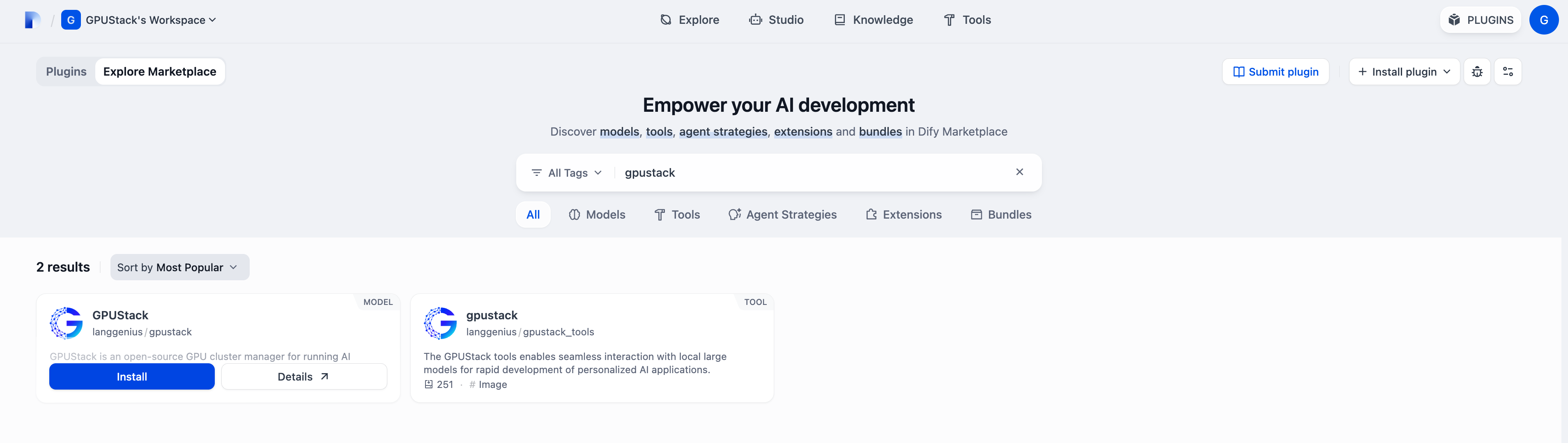 PLUGINS, selectInstall from Marketplace, search for the GPUStack plugin, and choose to install it.