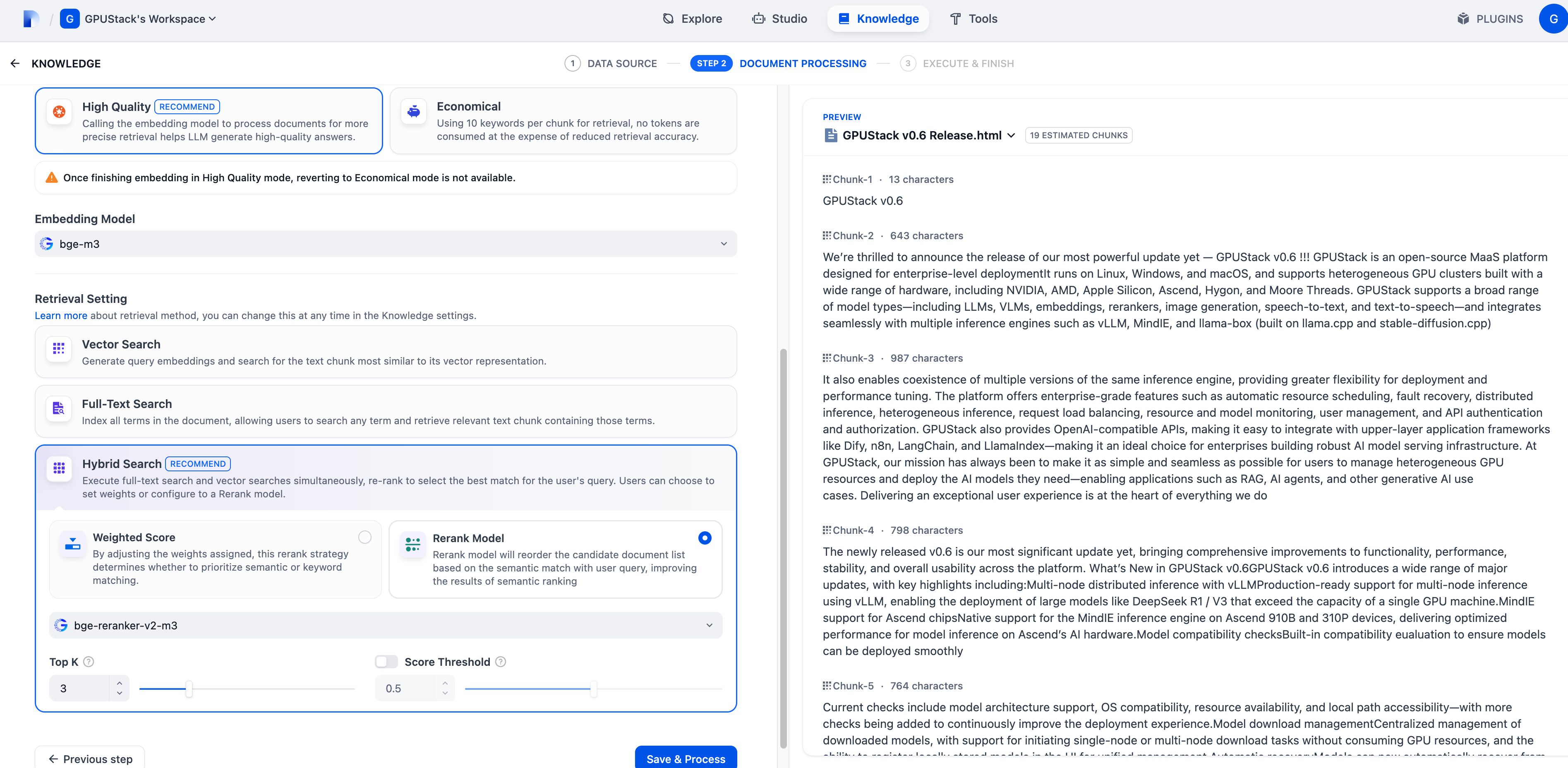 - Configure the Chunk Settings and Retrieval Settings. Use the embedding model to generate document embeddings, and the rerank model to perform retrieval ranking.