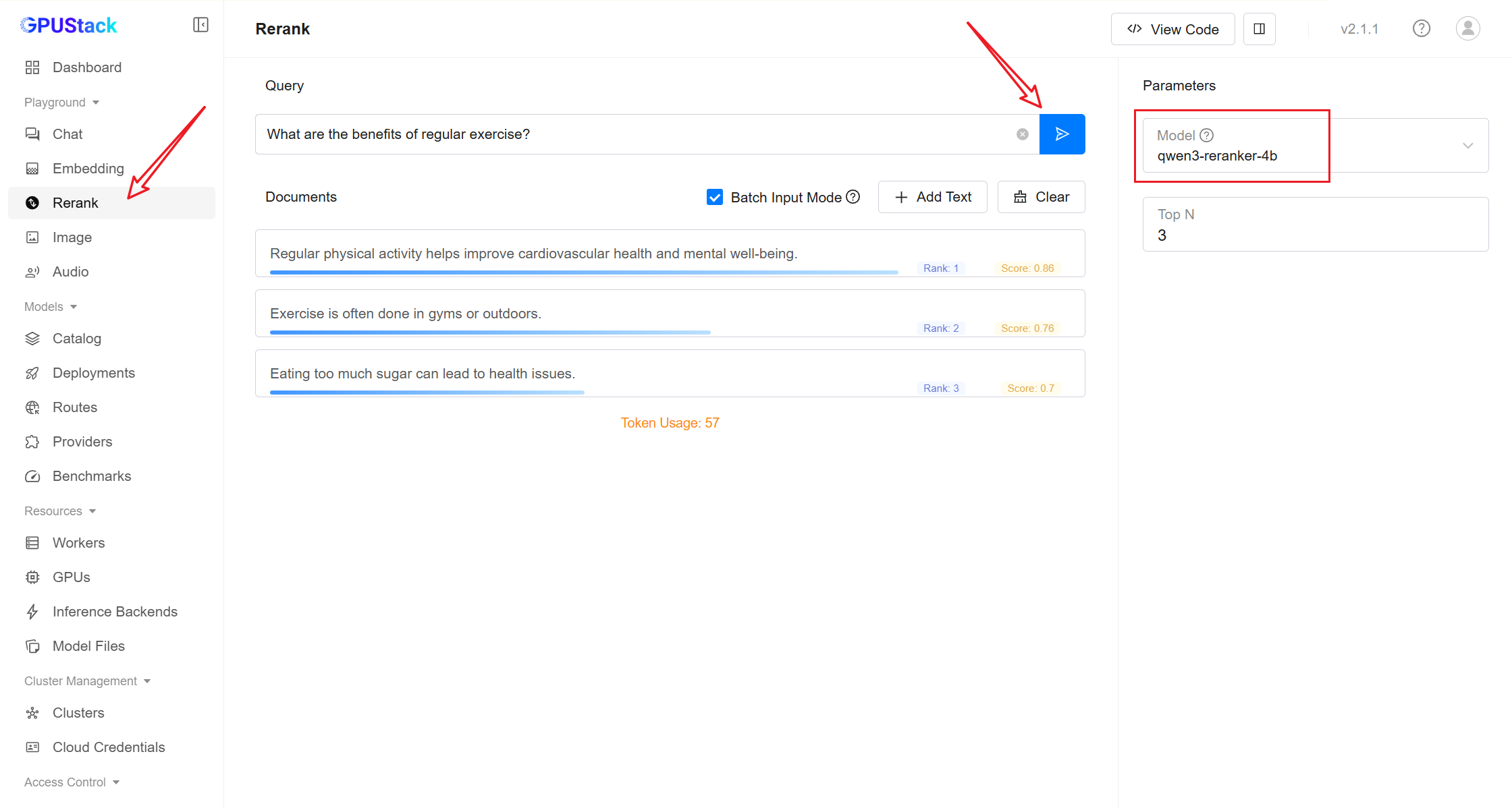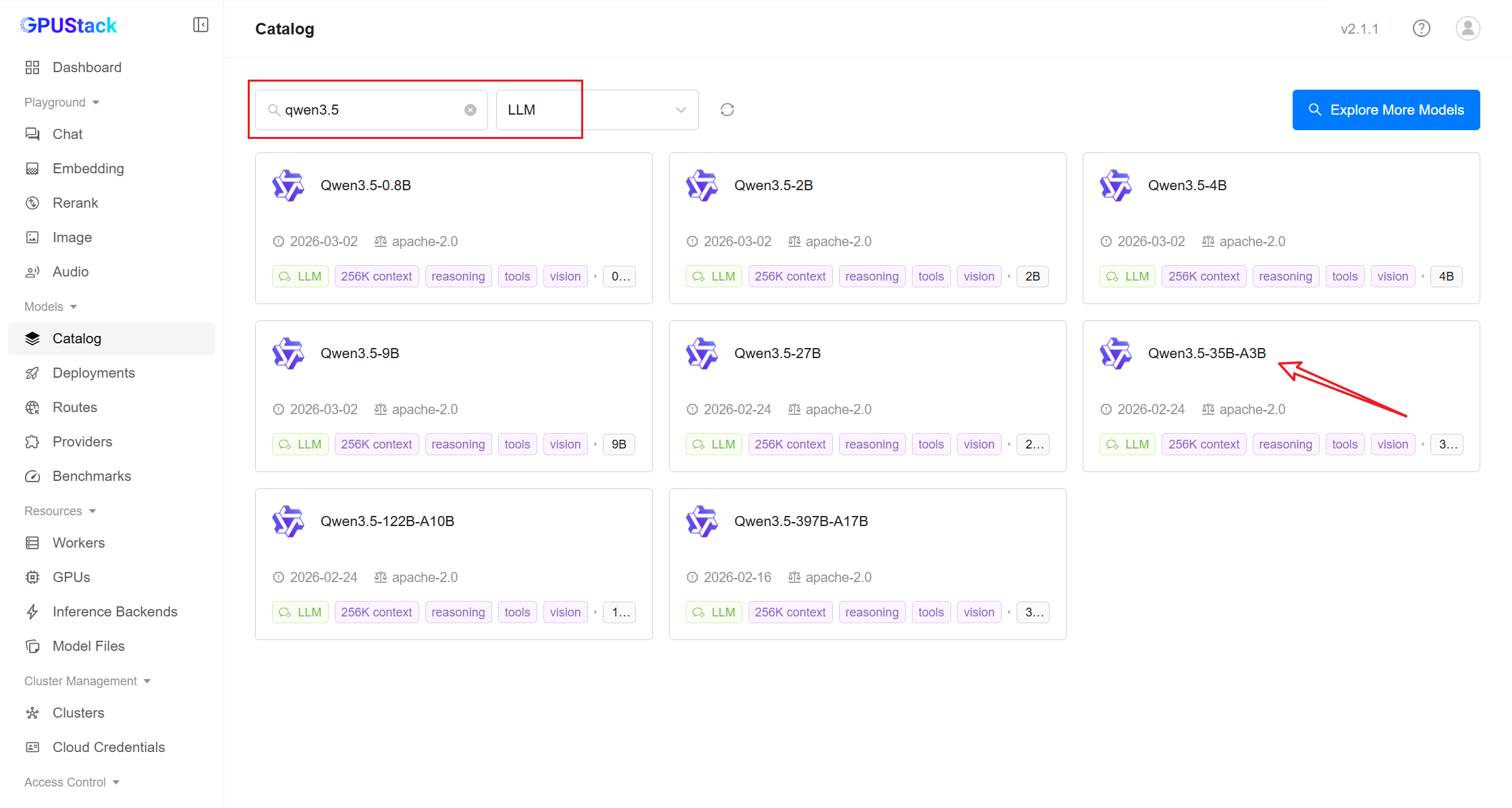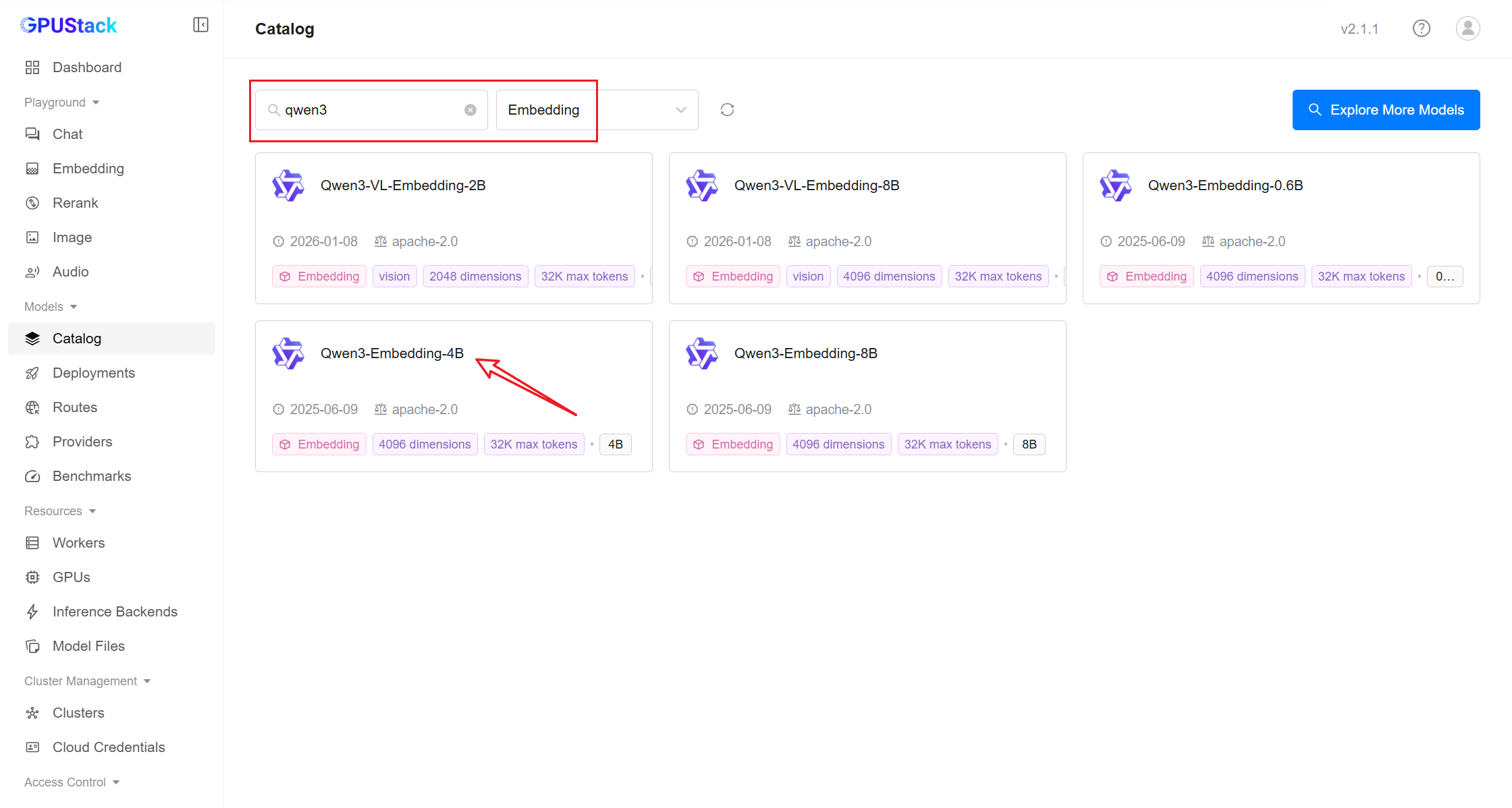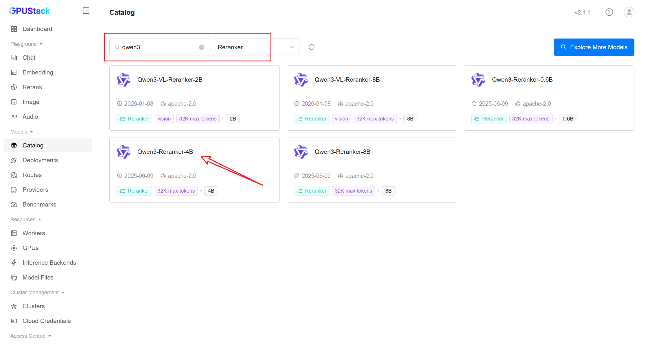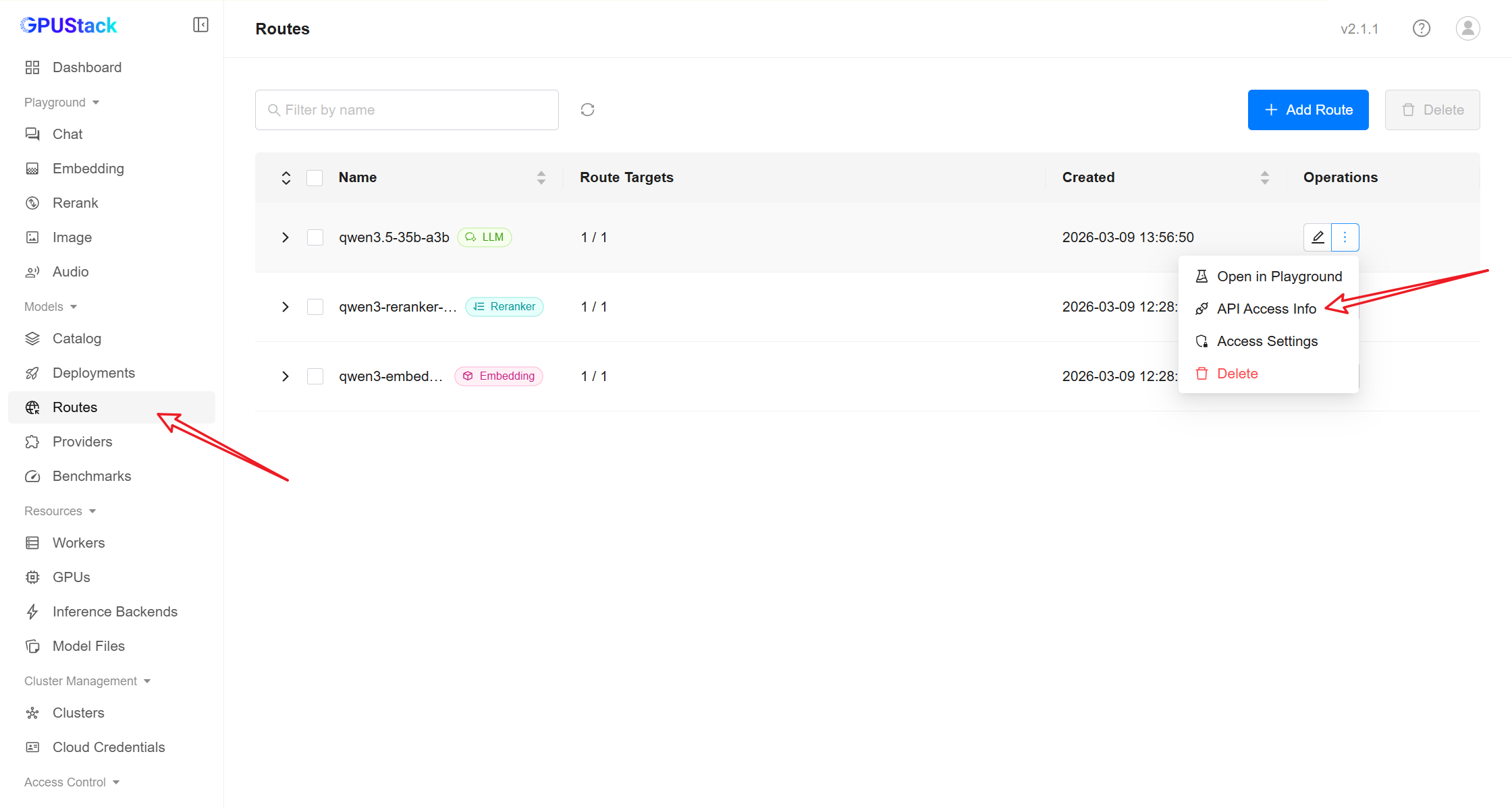 1. In GPUStack UI, navigate to the Deployments page and click on Deploy Model to deploy the models you need. Here are some example models: