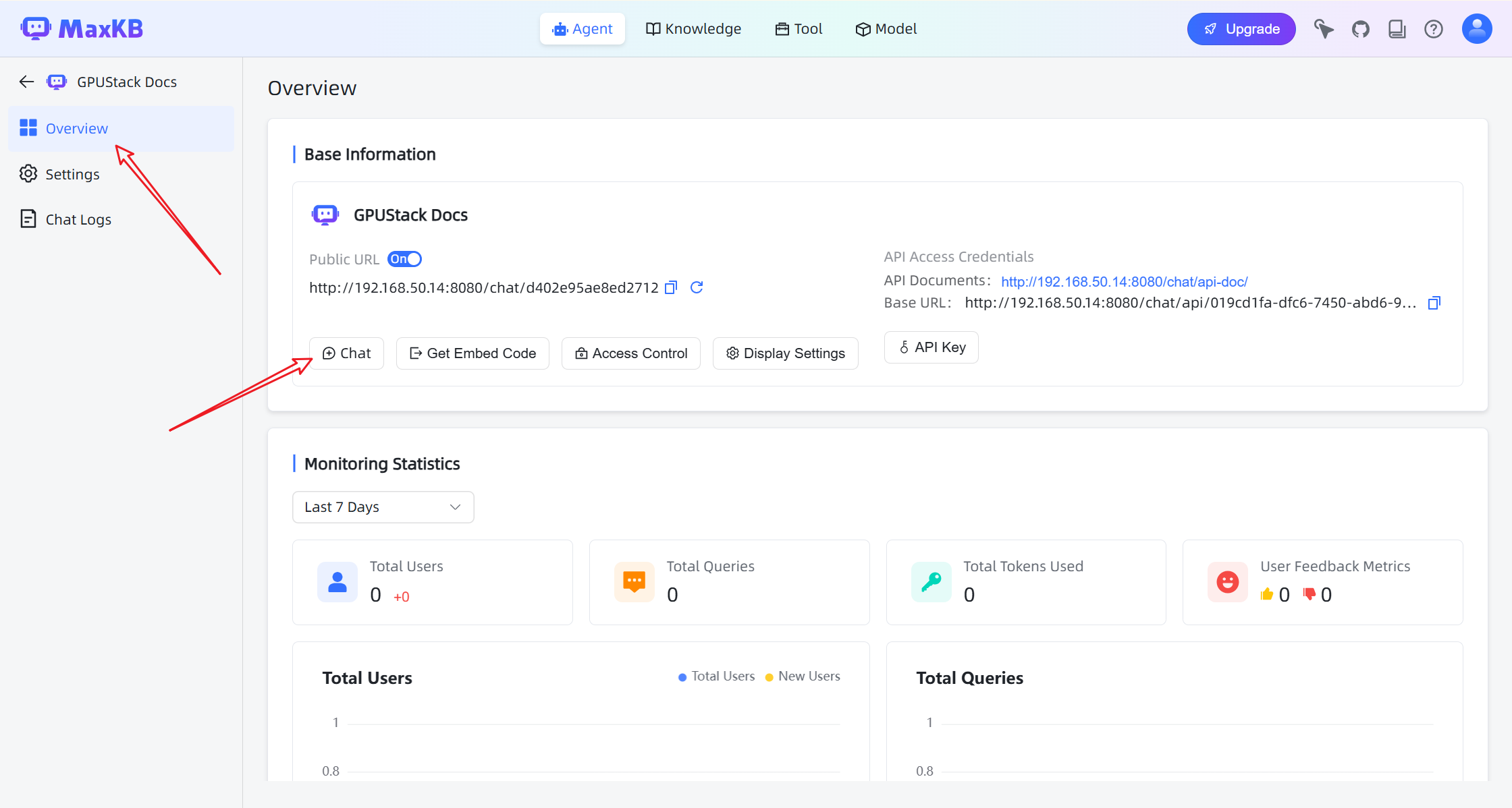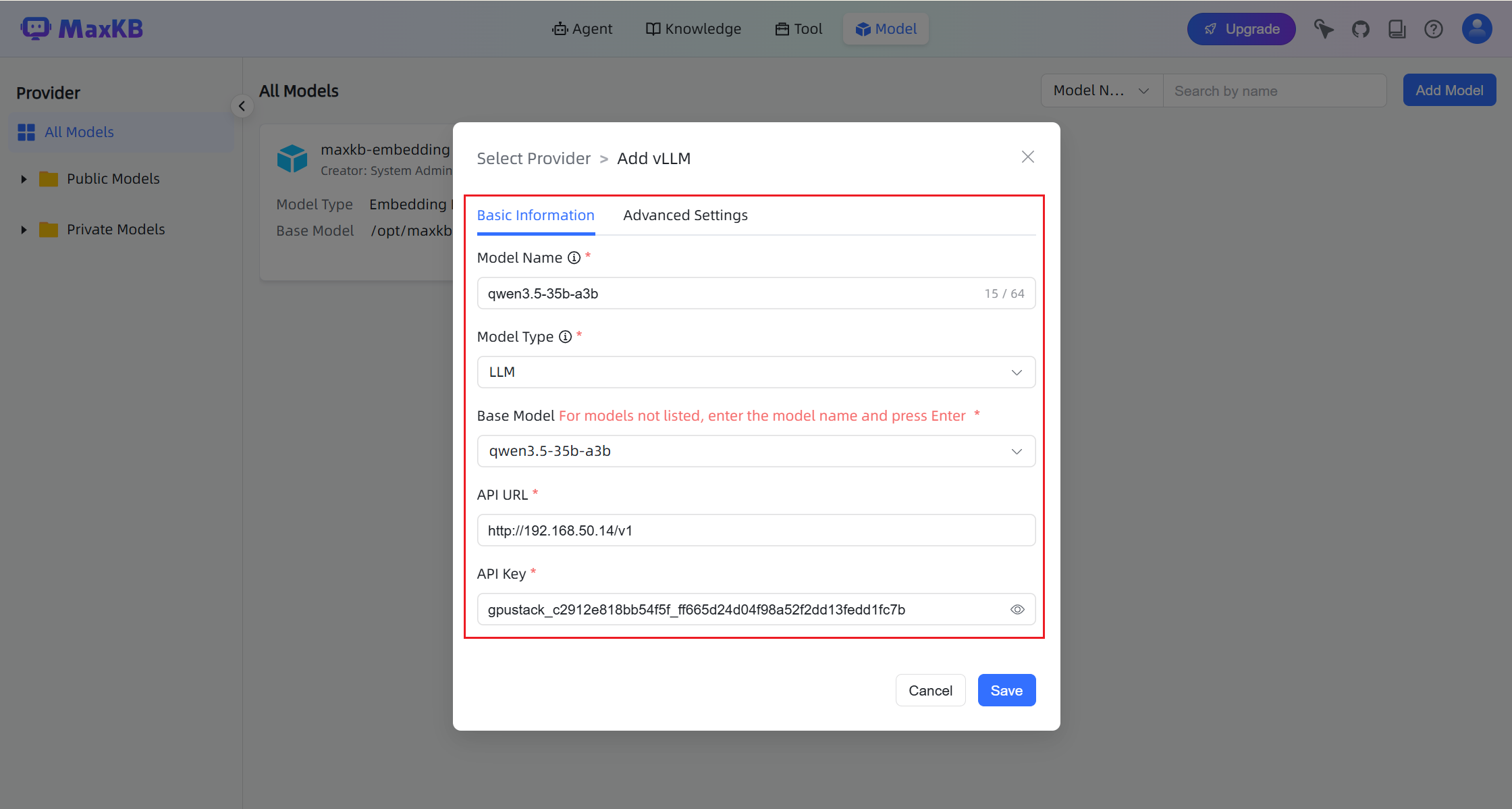 MaxKB can integrate with GPUStack to leverage locally deployed LLMs, embedding models, and reranking models for building knowledge-based AI assistants.