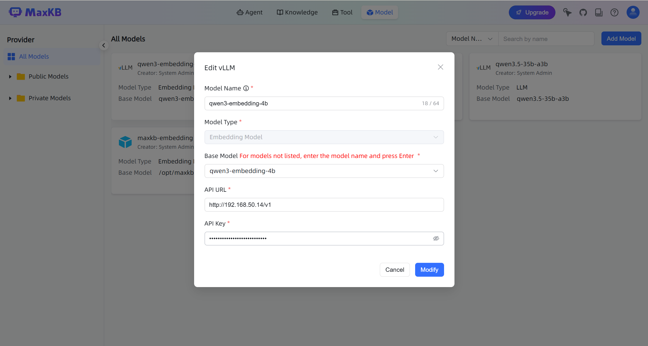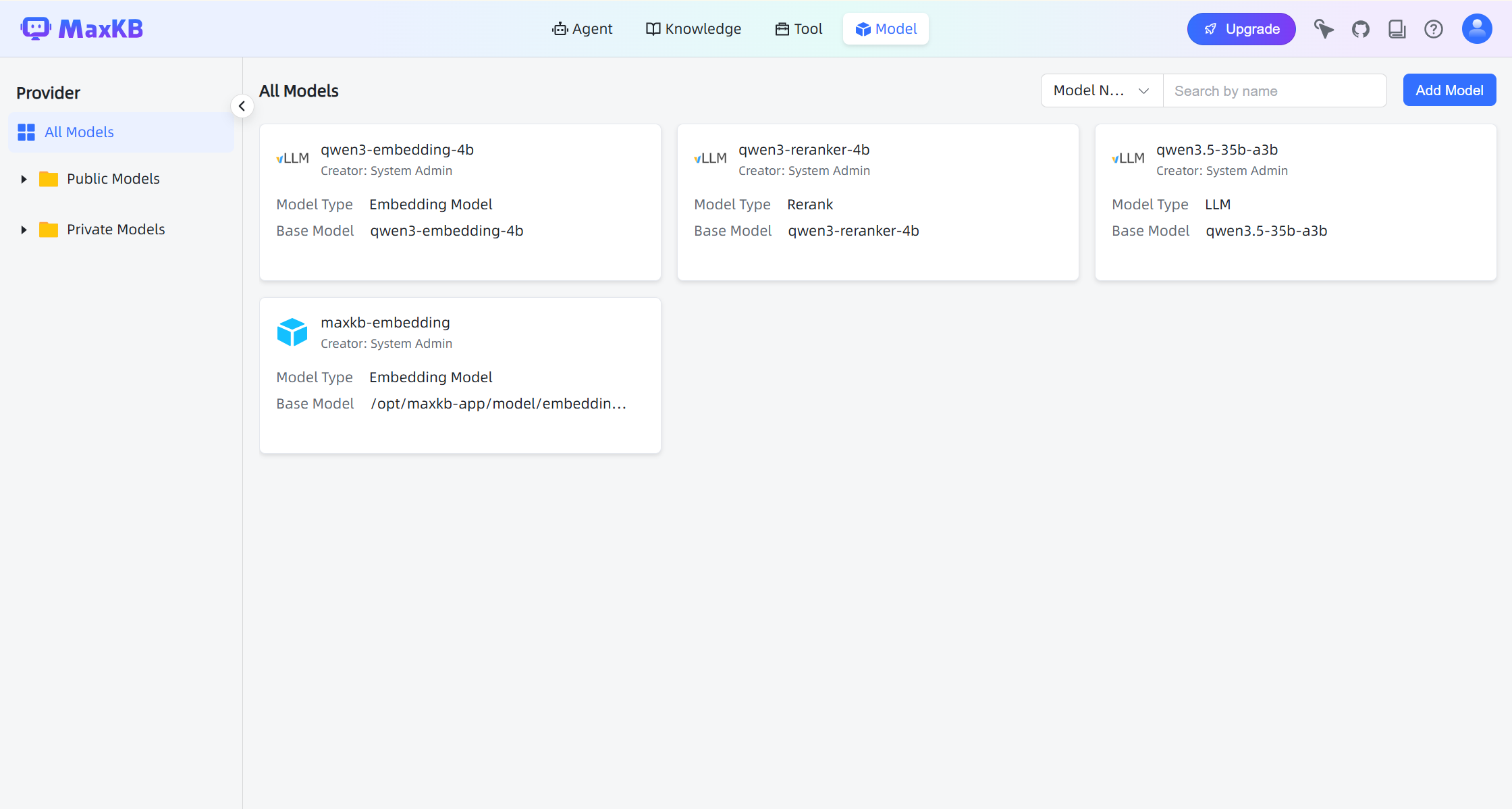 1. In the MaxKB UI, navigate to Model in the top navigation bar.