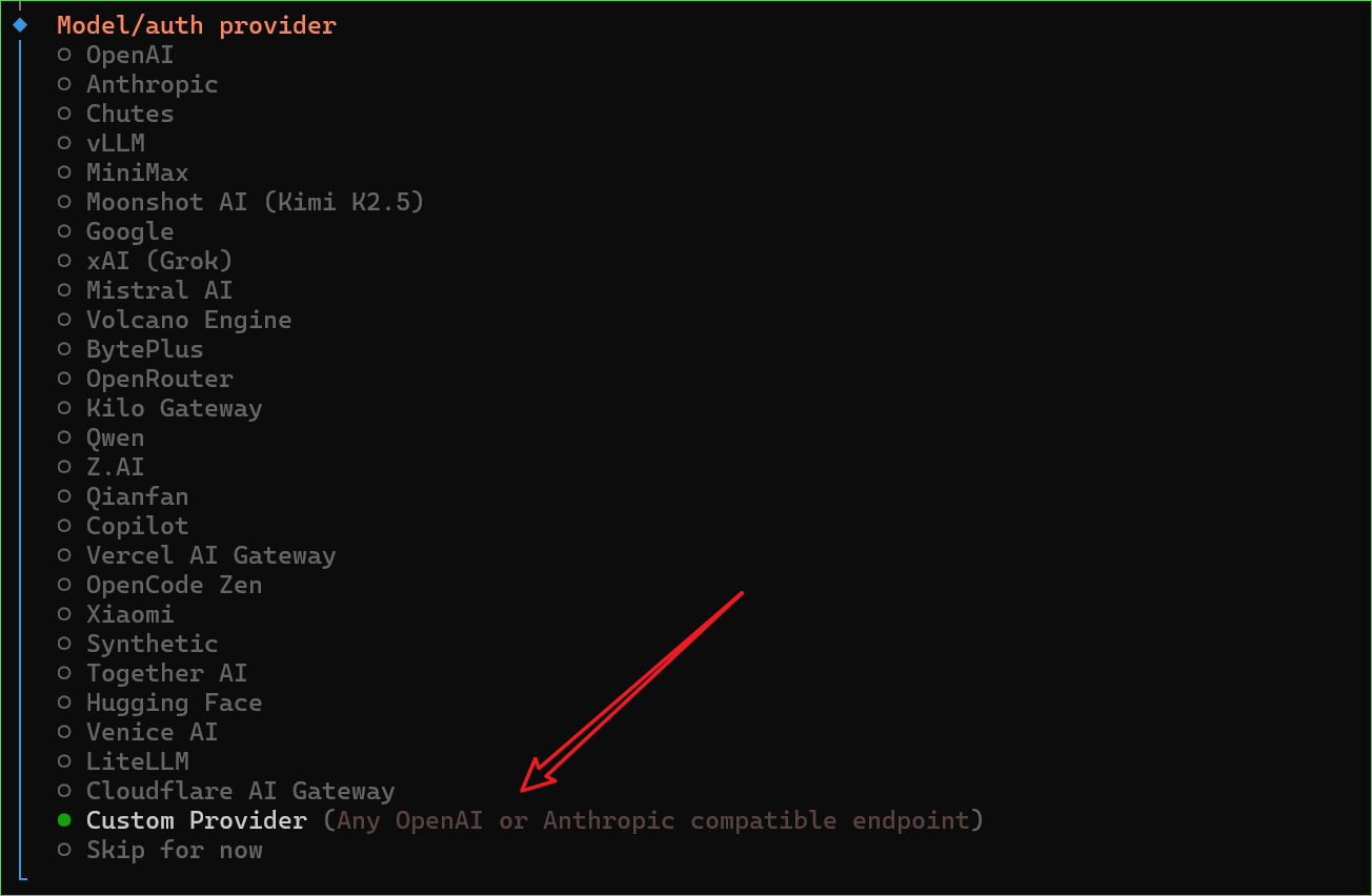 - In the Model / Auth Provider selection, choose Custom Provider