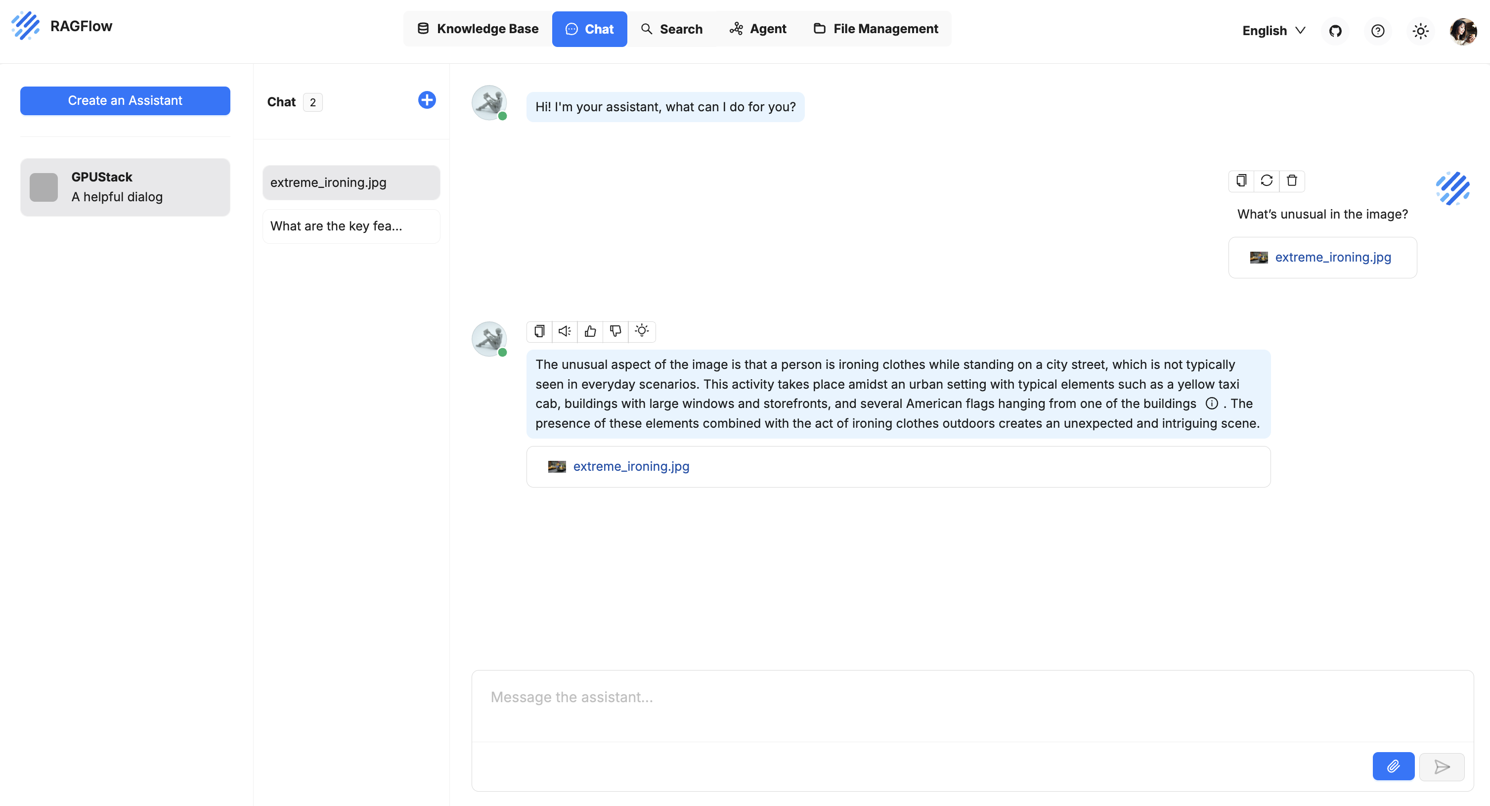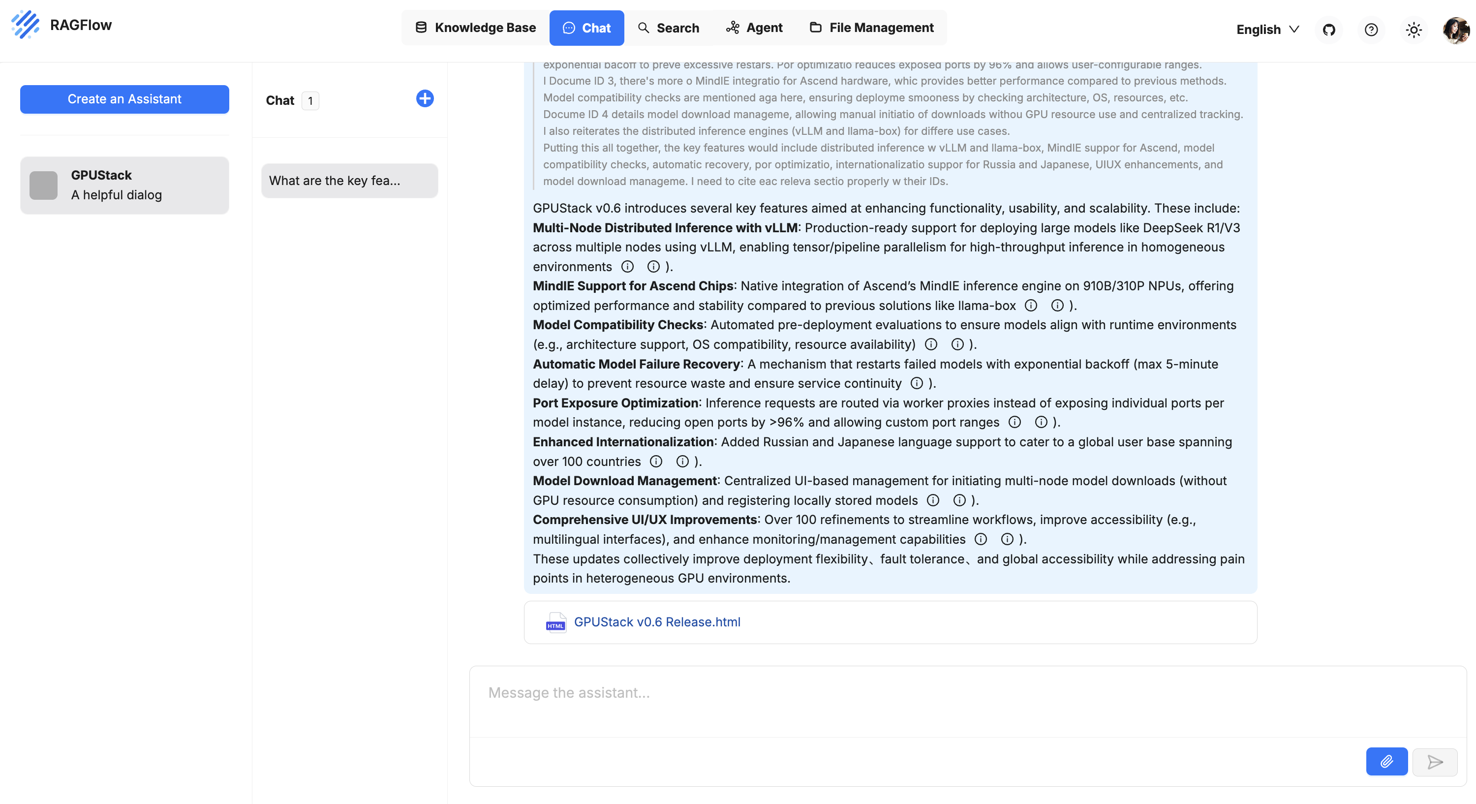 RAGFlow can integrate with GPUStack to leverage locally deployed LLMs, embeddings, reranking, Speech-to-Text and Text-to-Speech capabilities.
