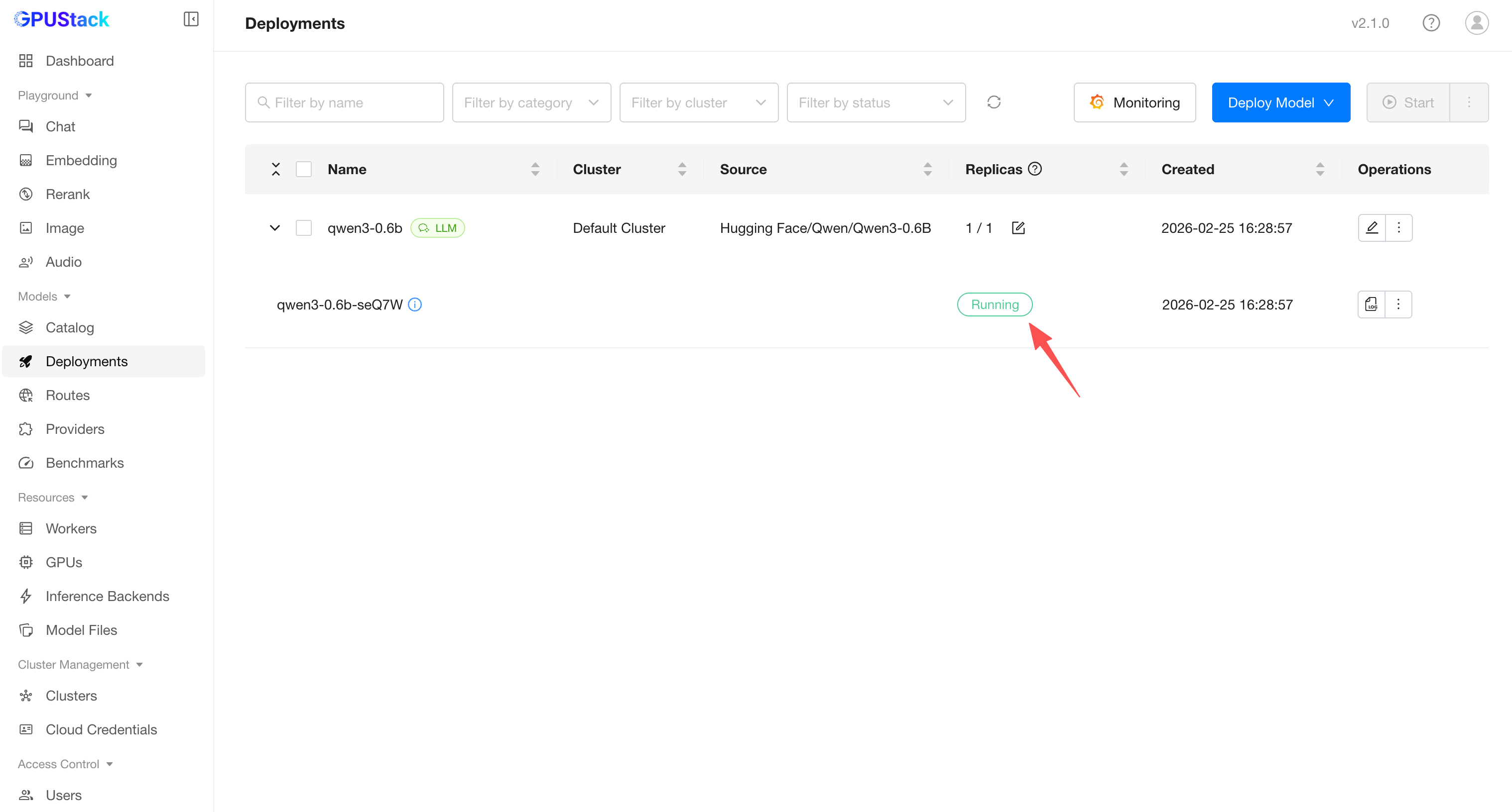 - GPUStack will start downloading the model files and deploying the model. When the deployment status shows