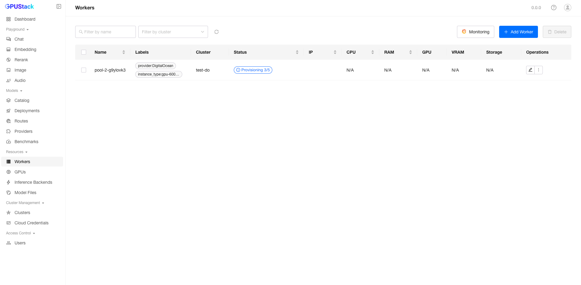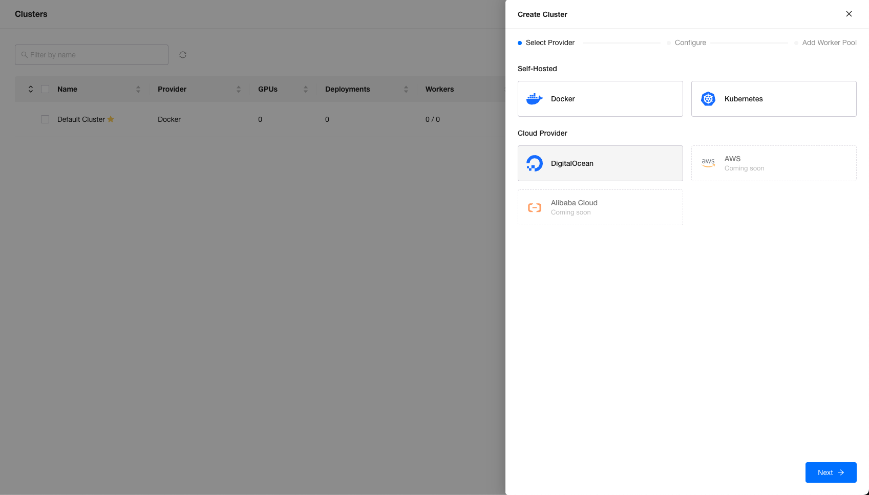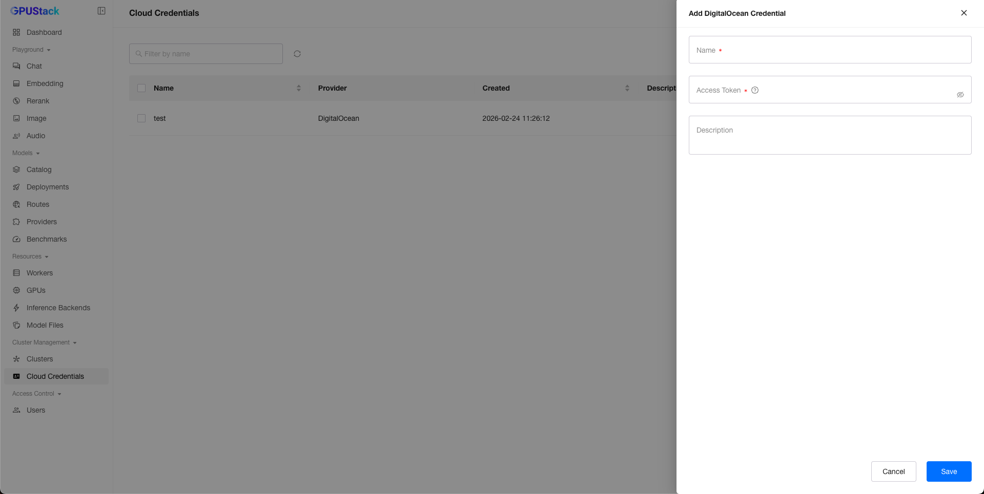 When creating a cluster, GPUStack can leverage DigitalOcean to create workers and add them to the GPUStack cluster.