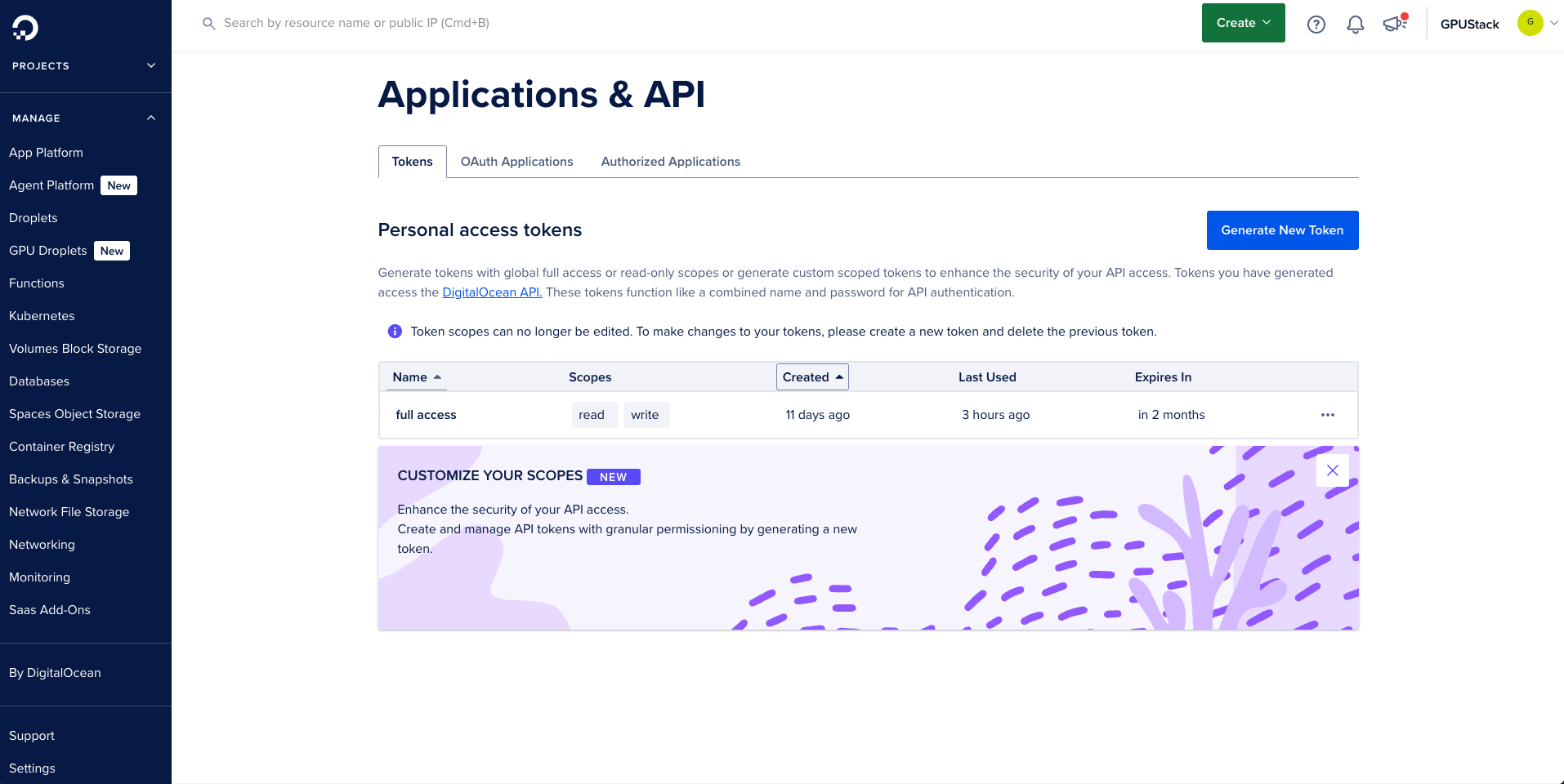 Note: The token scope must be set to Full Access. If you select permissions using Custom Scopes, you may encounter issues deleting droplets.