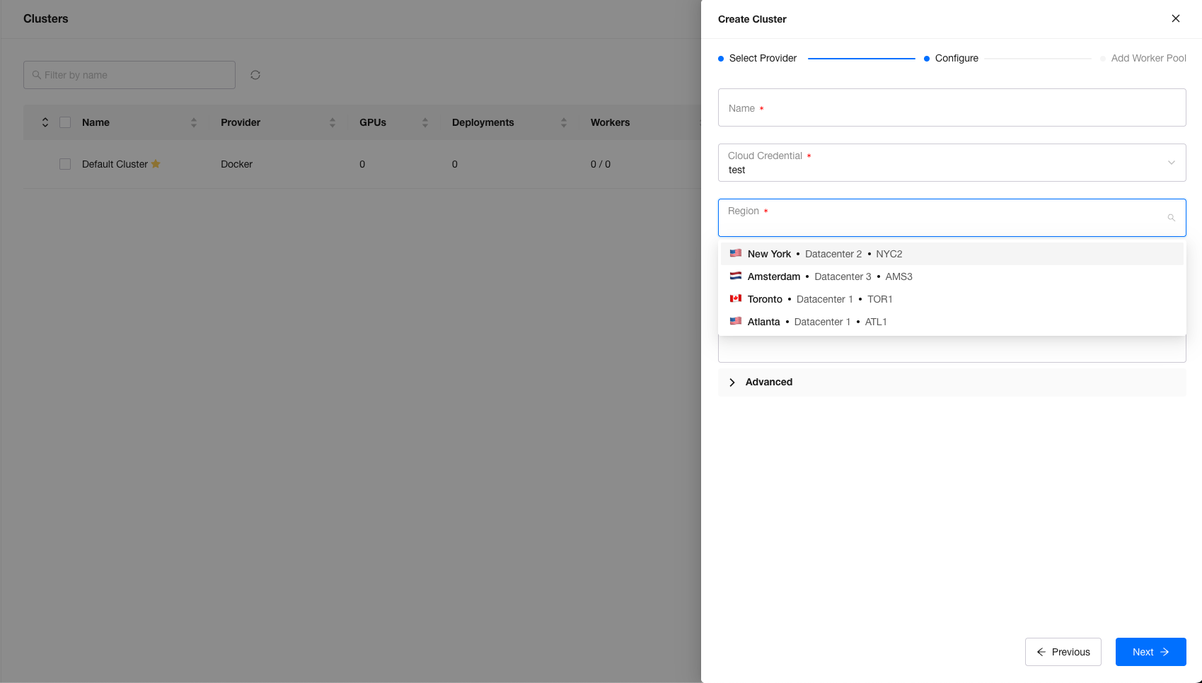Enter a name, select the cloud credential you just created, and choose a region that supports GPU droplets.