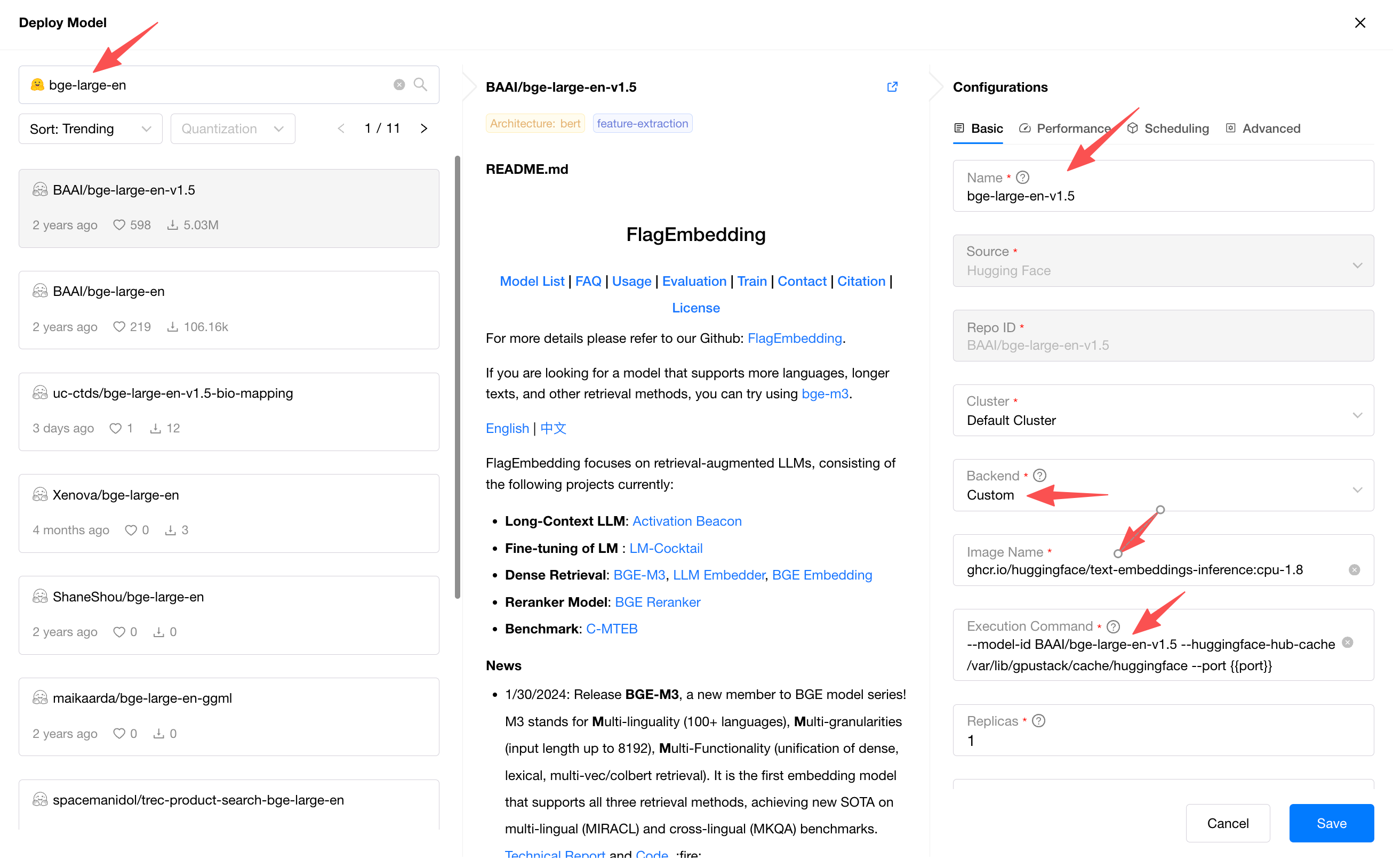 Execution Command: --model-id BAAI/bge-large-en-v1.5 --huggingface-hub-cache /var/lib/gpustack/cache/huggingface --port {{port}}