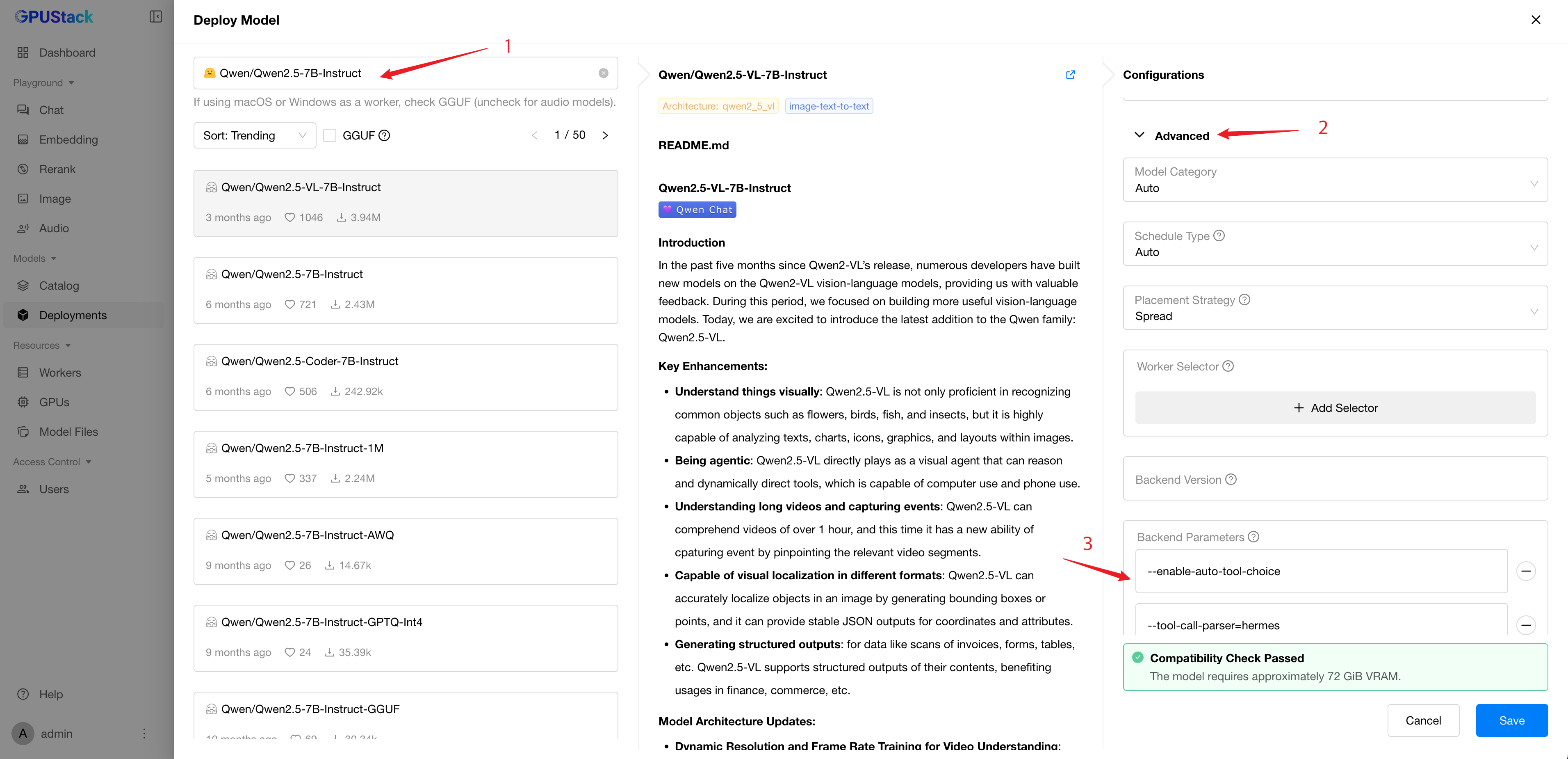 Deploymentspage in the GPUStack UI and click theDeploy Modelbutton. In the dropdown, selectHugging Faceas the source for your model. - Enable the