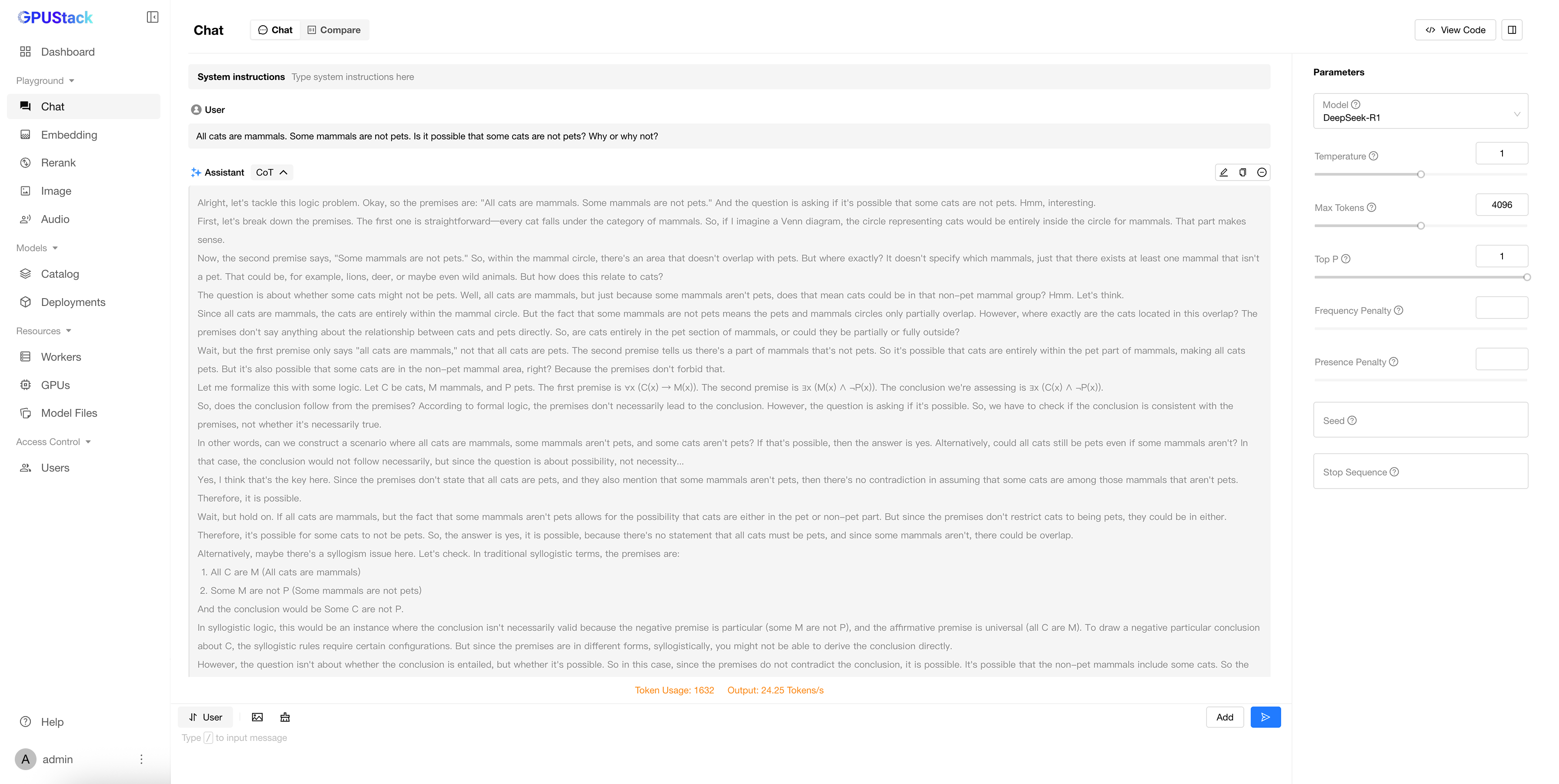 You have now successfully deployed and run DeepSeek R1 671B using Distributed vLLM on a GPUStack cluster. Explore the model’s performance and capabilities in your own applications.