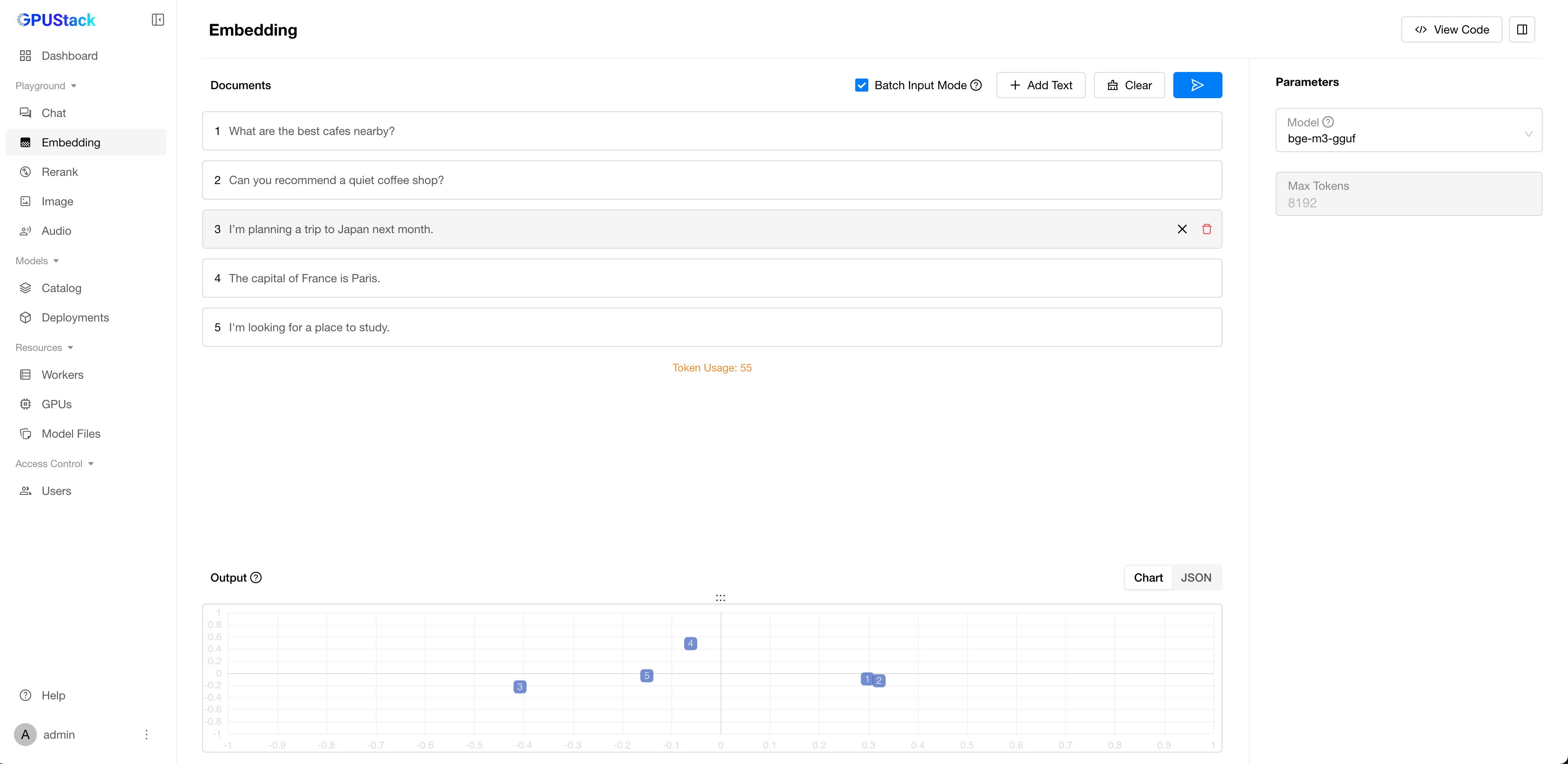 The Embedding Playground lets you test the model’s ability to convert text into embeddings. It allows you to experiment with multiple text inputs, visualize embeddings, and review code examples for API integration.