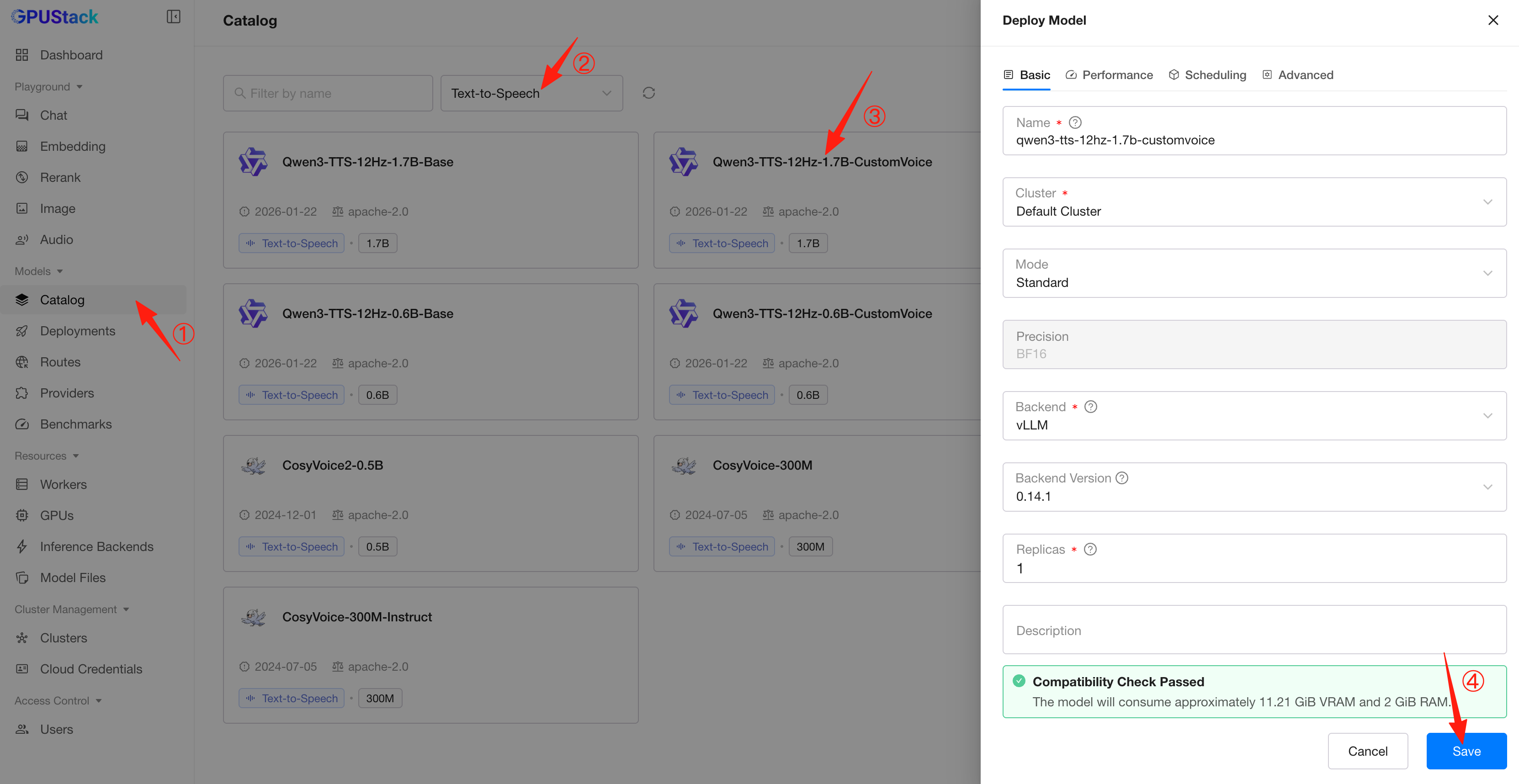 Text-to-Speechin the category filter, then select theQwen3-TTS-12Hz-1.7B-CustomVoicemodel. - Leave everything as default and click the