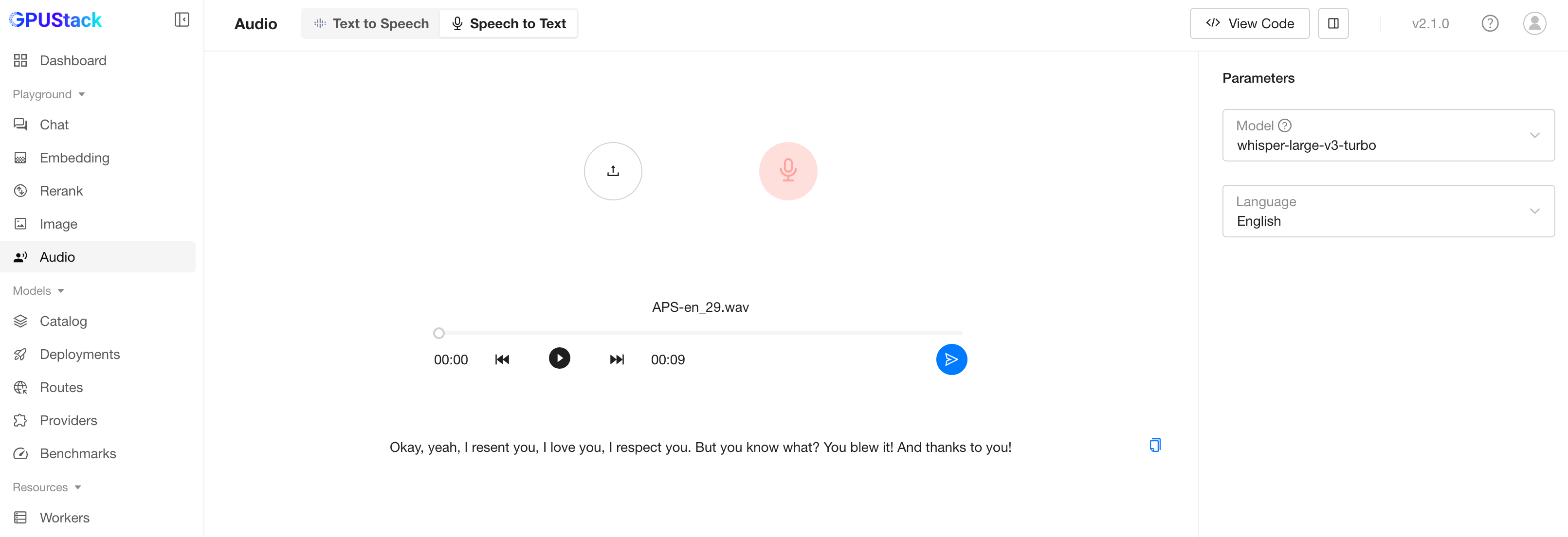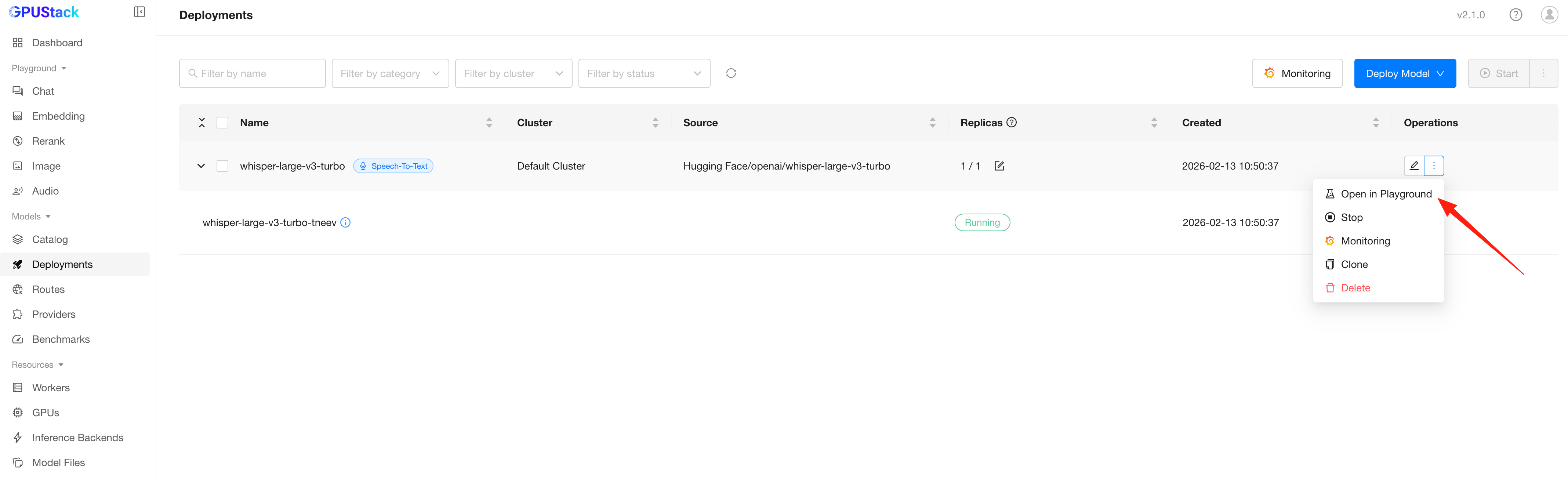 In this guide, we will walk you through deploying and using Speech-to-Text and Text-to-Speech models in GPUStack.