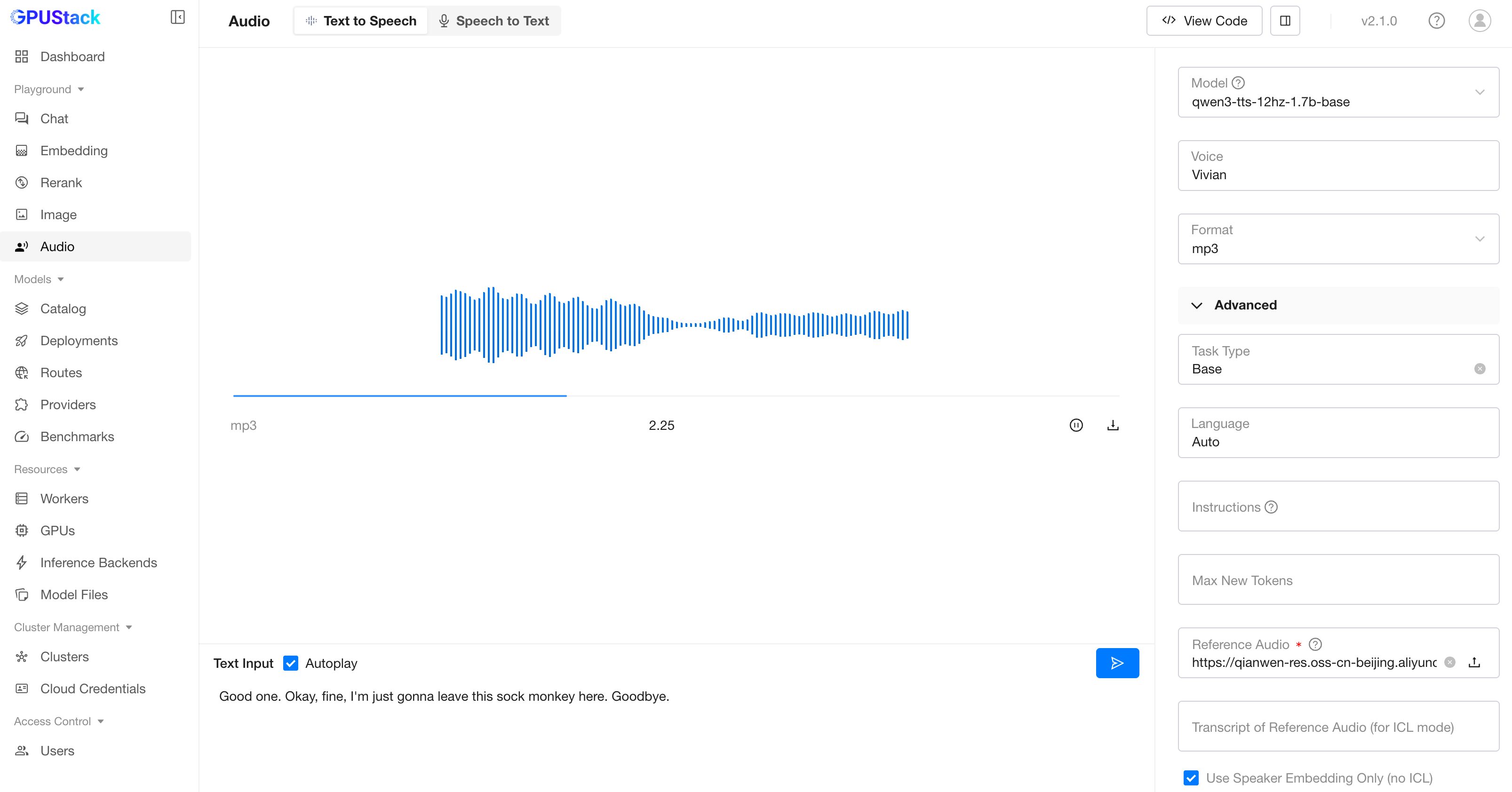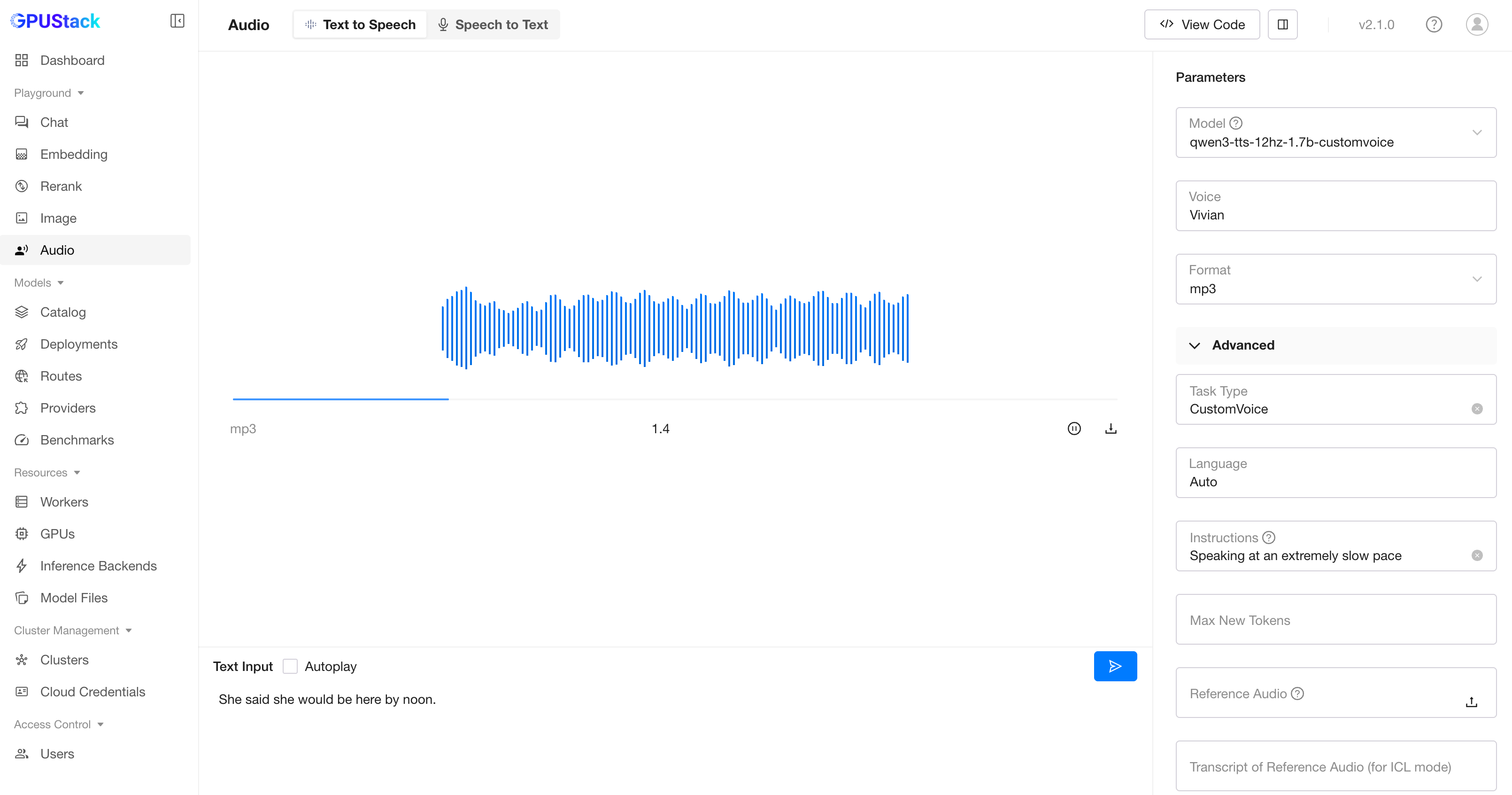 GPUStack also supports voice cloning with Text-to-Speech models. Here's how to use it: