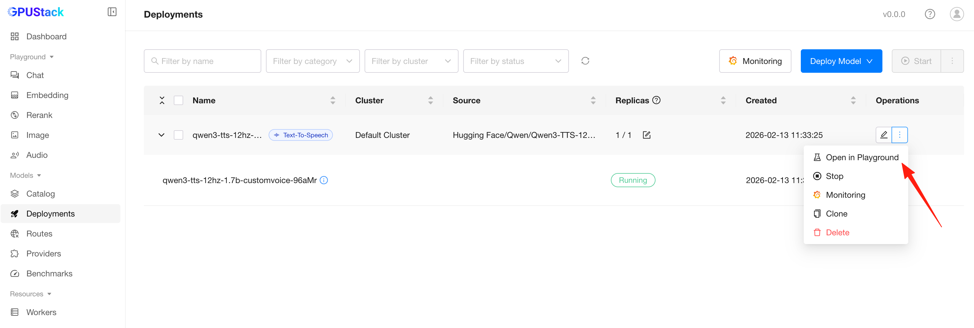 After deployment, you can monitor the model deployment's status on the Deployments page. Once the deployment is successful, click the ellipsis icon of the deployment and select Open in Playground to start using the model in the Playground.