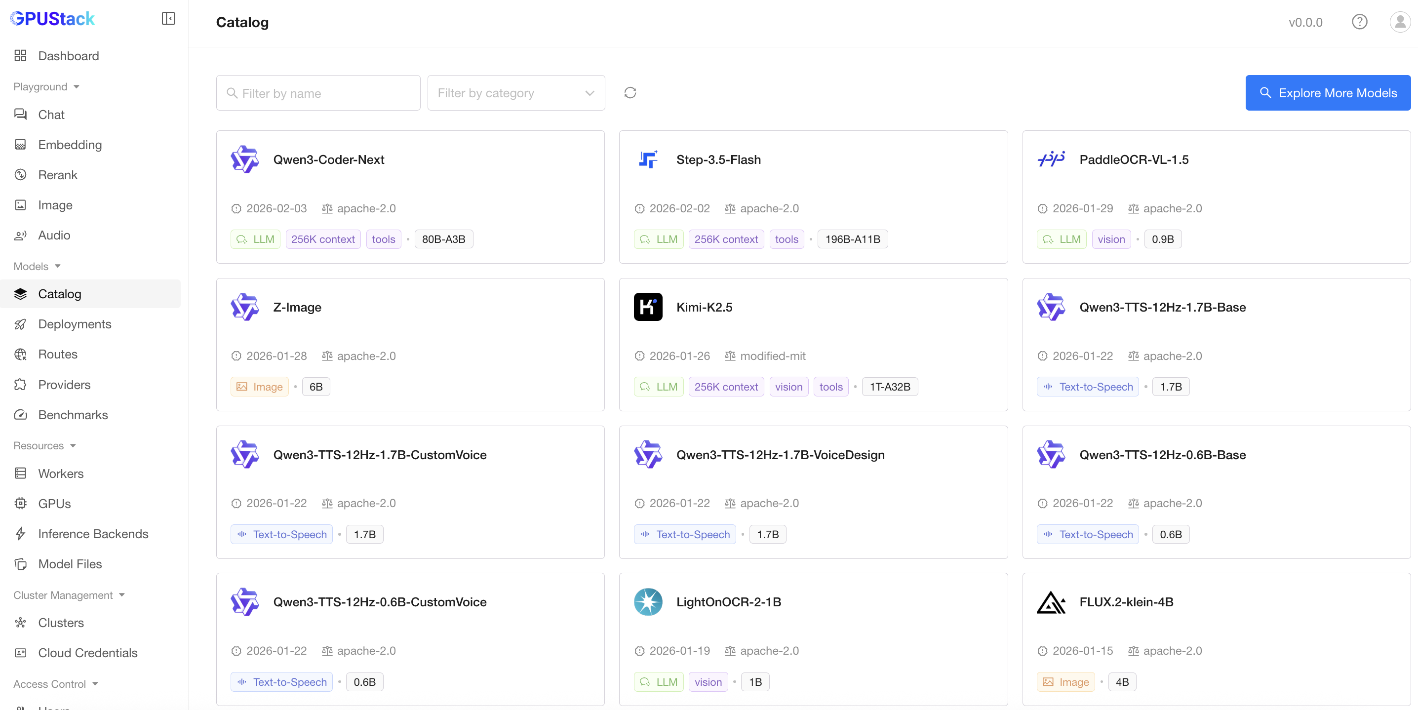 Catalogpage in the GPUStack UI. - In the model list page, use dropdown to filter with